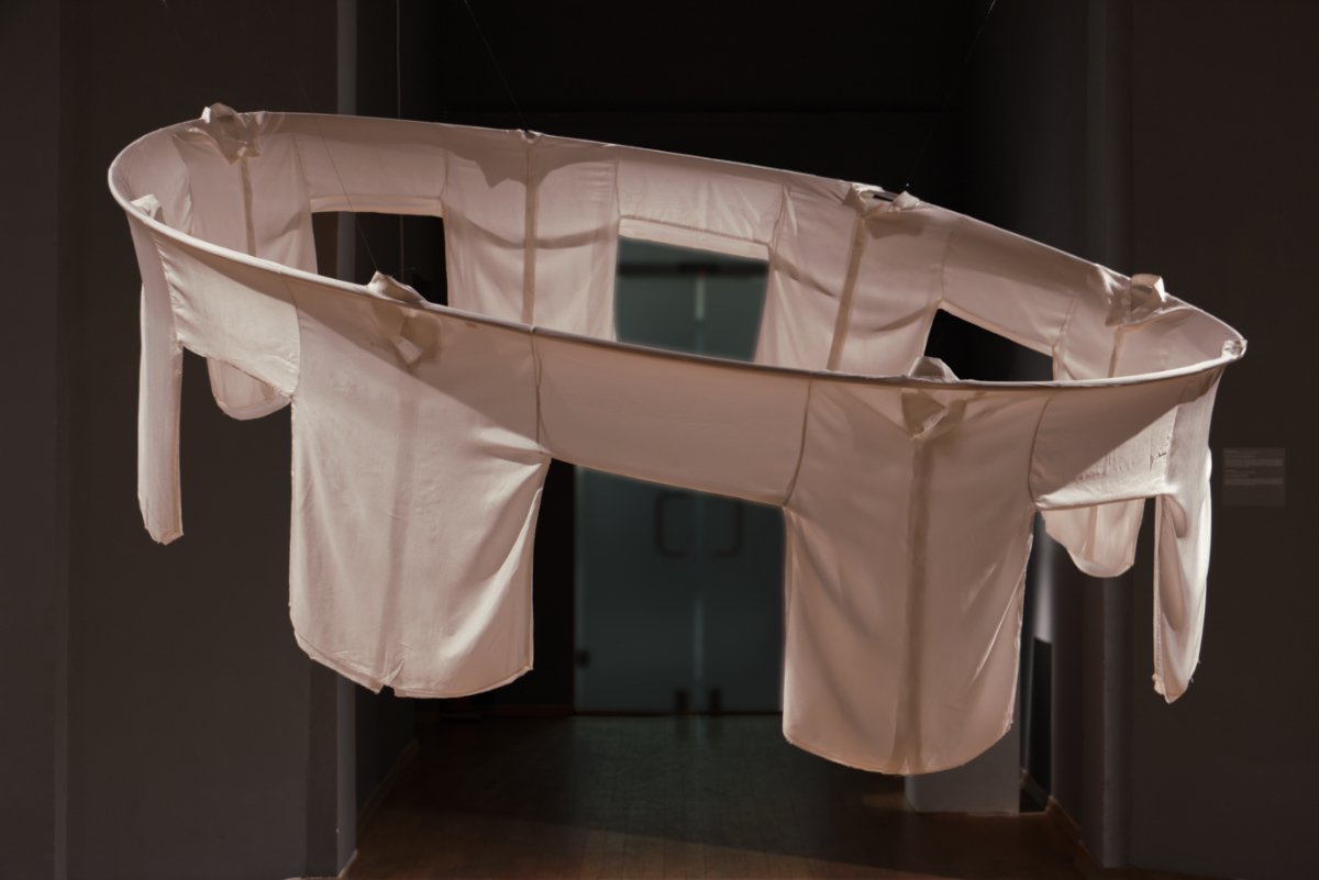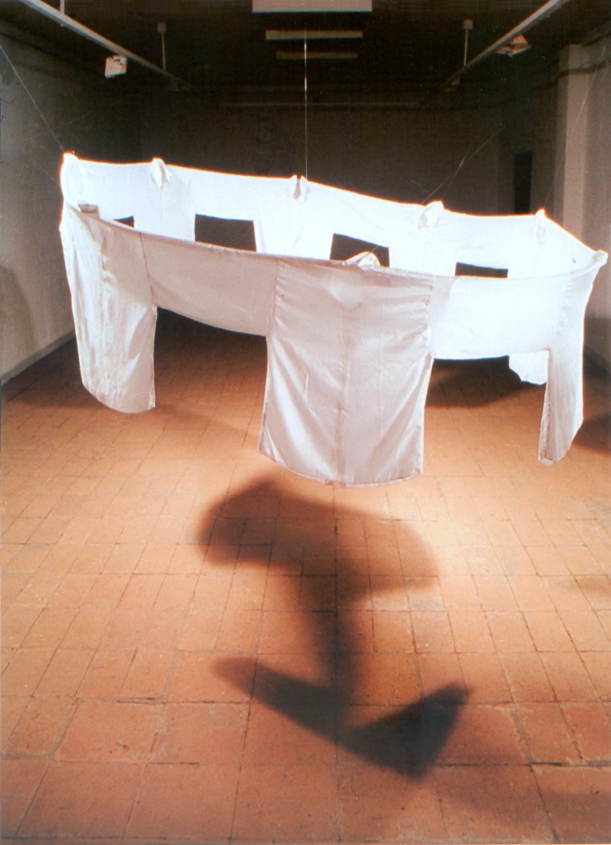 Let's Dance utilizes a technique from the craft of cloths design. The 10 white shirst presented in the installation are sewed with one sleeve serving two adjacent shirts, leaving no individual space for movement outside of the circular group. The group that dances on the accompaniment of a small portable cassette player, playing traditional Bulgarian (semi-ritual) dance music "Horo".