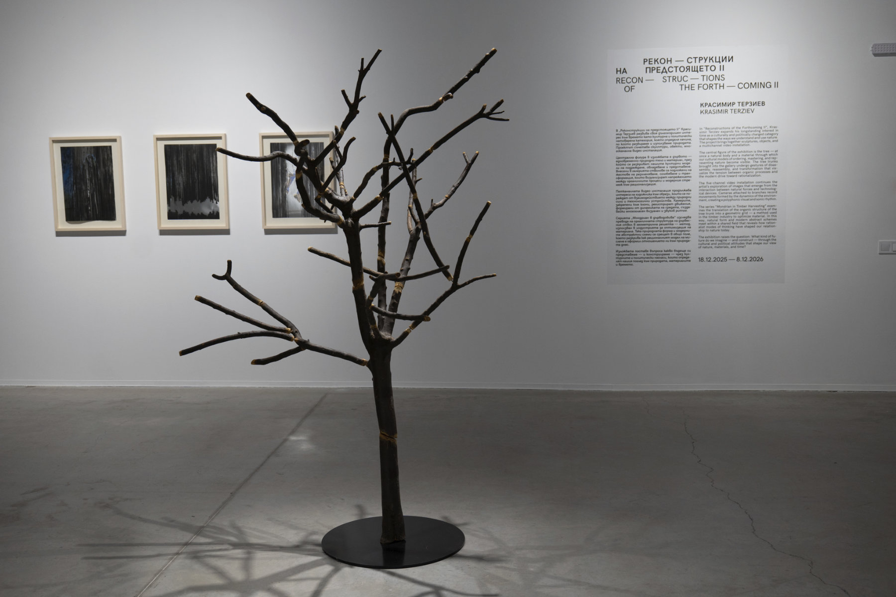 Дърветата, внесени в галерията, претърпяват жестове на раздробяване, повторно сглобяване и трансформация, които разкриват напрежението между органичния и културния режим на структуриране. Едно дърво, насечено на дърва за огрев и повторно сглобено с леки размествания, визуализира прекъсването и пренареждането на естествения растеж и форма.