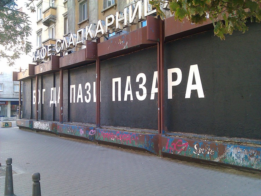 The intervention in public space God save... is a white text stenciled on the black background of the facade of an abandoned restaurant in the center of Sofia. The text reads "God save the Market". The work is part of series placing a critique of the Global Financial and Economic cryses from 2008-2012, the market crash that played an apotheosis of the Neoliberal turn as fars.