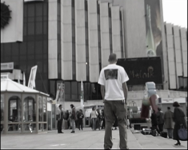 On the BG Track examines how film industry creates certain images of unknown, exotic cultures, as is the case with Bulgaria. The plot is structured on the juxtaposition of scenes shot on the streets of Sofia to five film excerpts. The camera follows a protagonist, walking in various parts of Sofia, then slowly zooms in, getting closer to his back, focusing on the image printed on the white t-shirt he is wearing. The image is a frame from the movie, an excerpt of which slowly fades in. Thus the printed film still is the vehicle moving the narrative between reality and fiction.