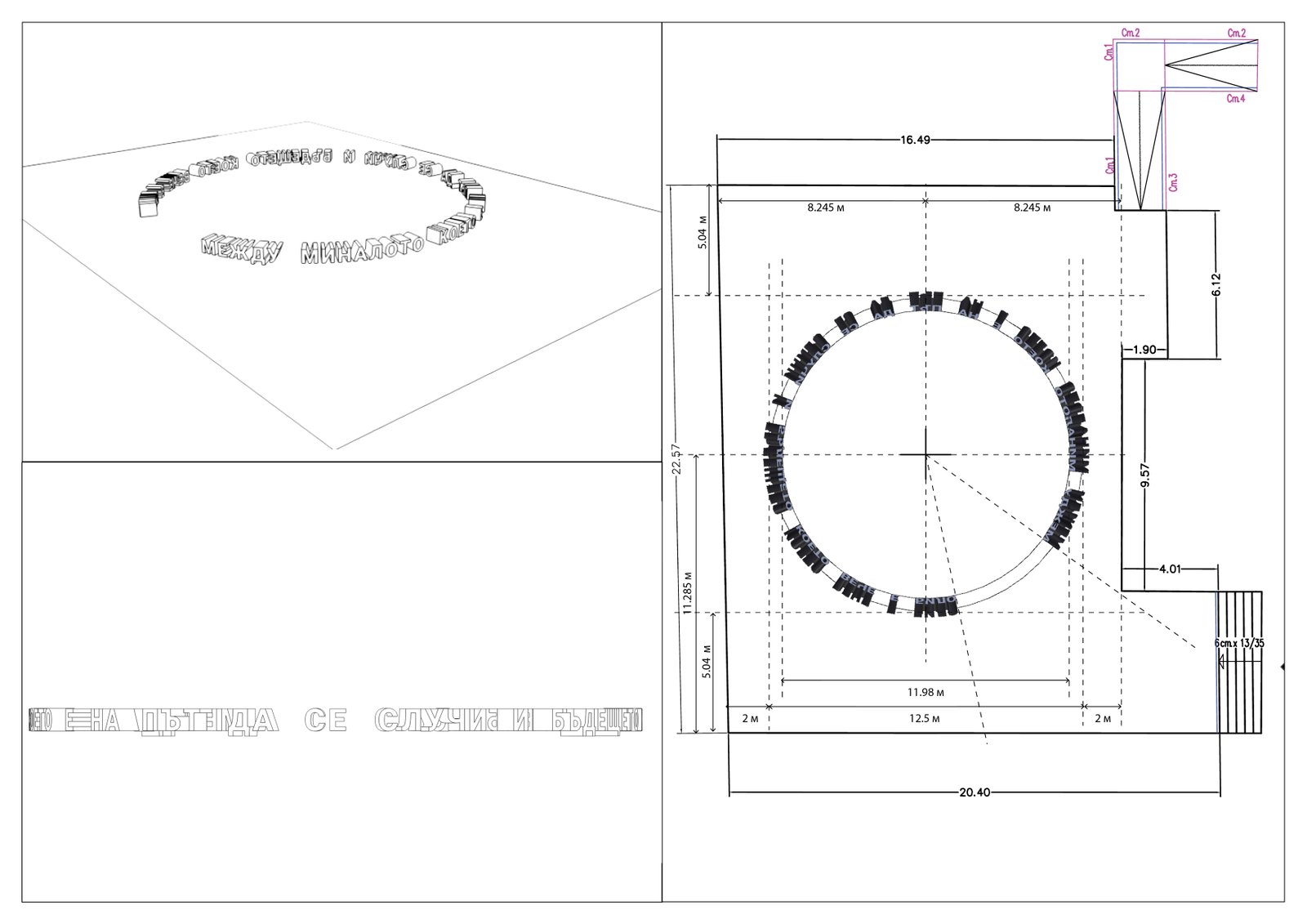 - volumetric double-sided illuminated letters, inscribed in a circle with an outer diameter of 10 m, height and depth of the letter 45 cm - dimensions that allow the installation to be inhabited and visitors to stay in the space of the circle