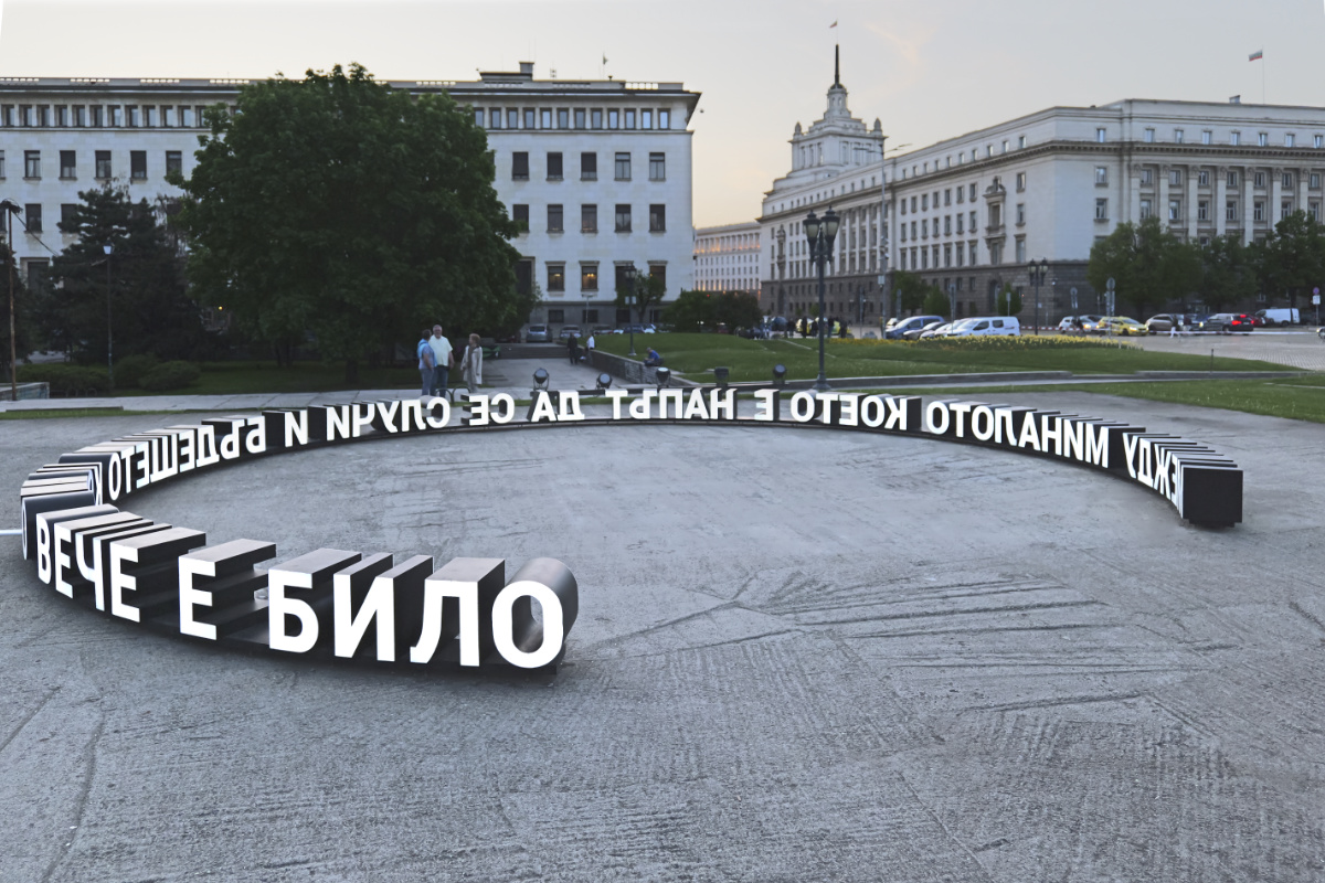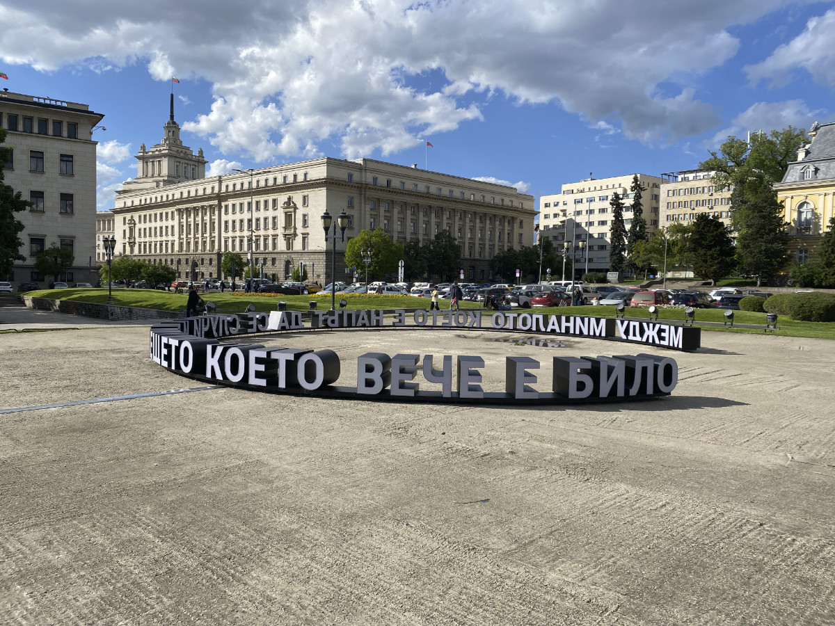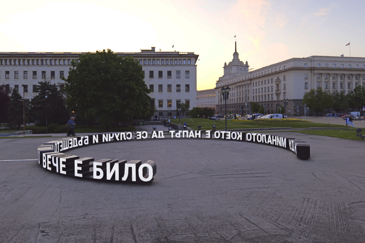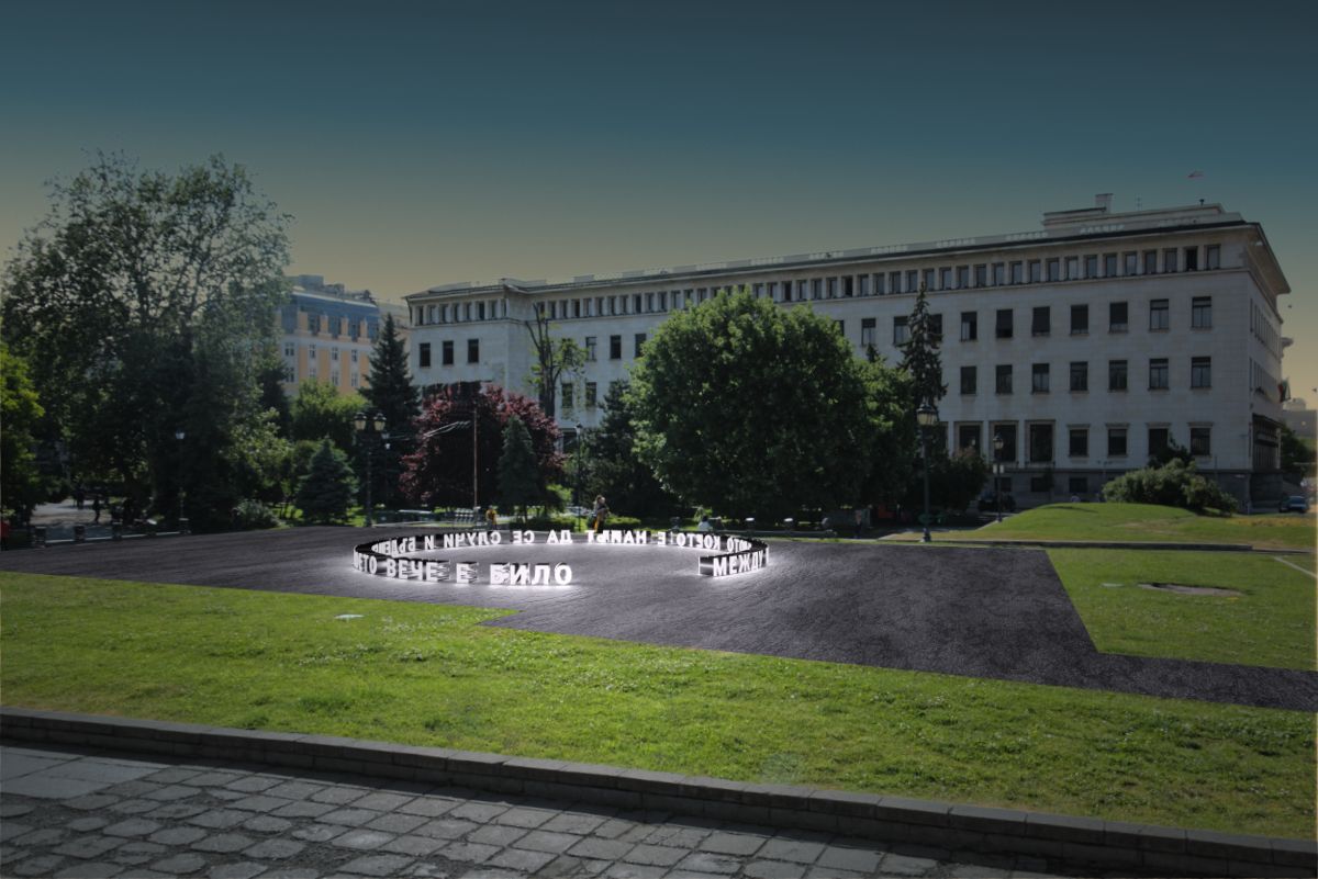 "Between the past that is about to happen and the future that has already been" is an art installation on the site of the former mausoleum of Georgi Dimitrov in the center of Sofia. It is related to the special symbolic significance of this place, which has left its mark on the city. But it is also addressed to visions of the future, in which we are not just the audience of monumental spectacles.