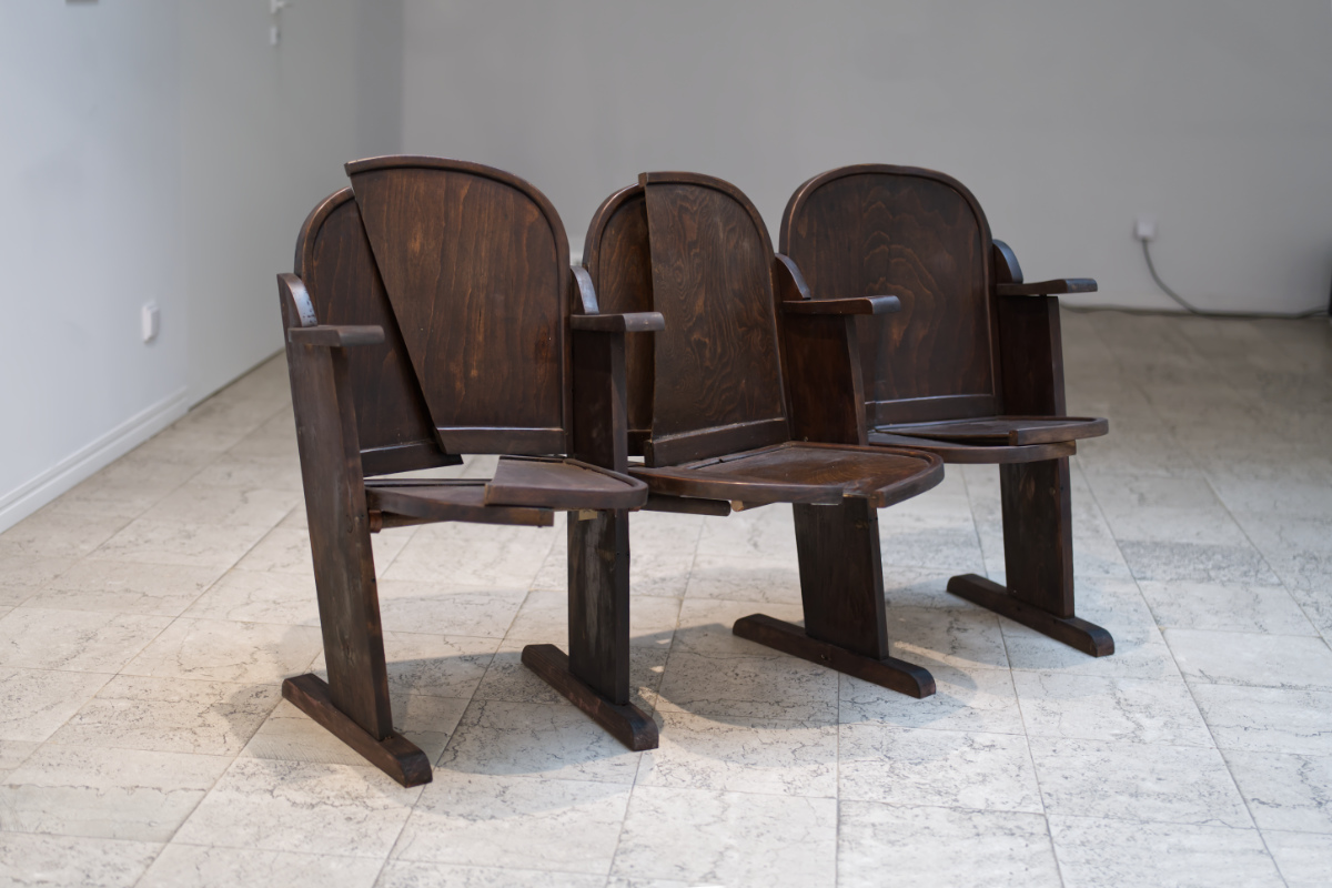 Perspective is a question that Krasimir Terziev frequently revisits. The seats in Film-theaters follow the model of the chirch - arranged in grid with all people seated, turned in the same direction (towards the screen or the altar). In this proposition the seats offer no common perspective.