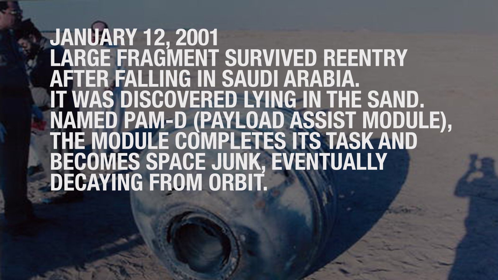 A large fragment survived reentry after falling in Saudi Arabia. It was discovered lying in the sand, weighing some 70kg. Named PAM-D (payload assist module), The module completed its task and became space junk, eventually decaying from orbit.