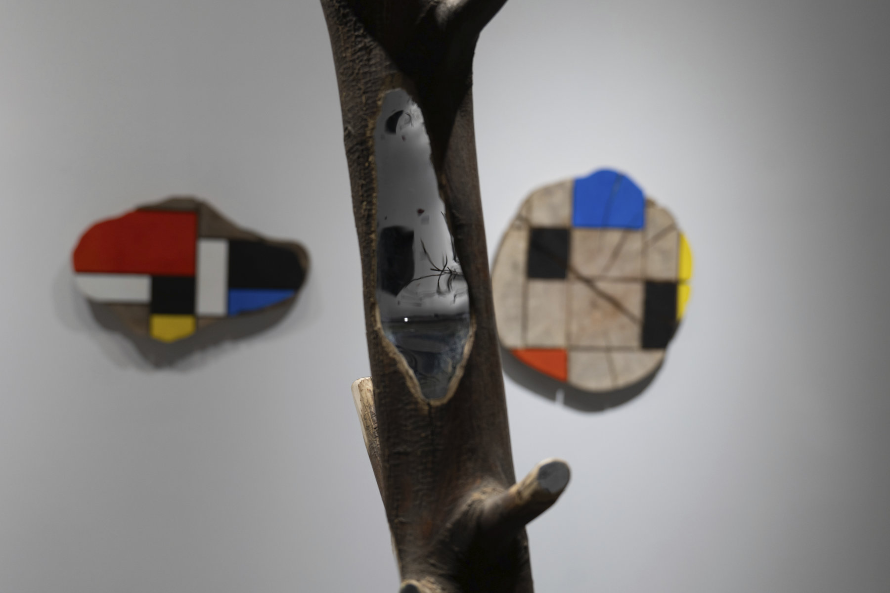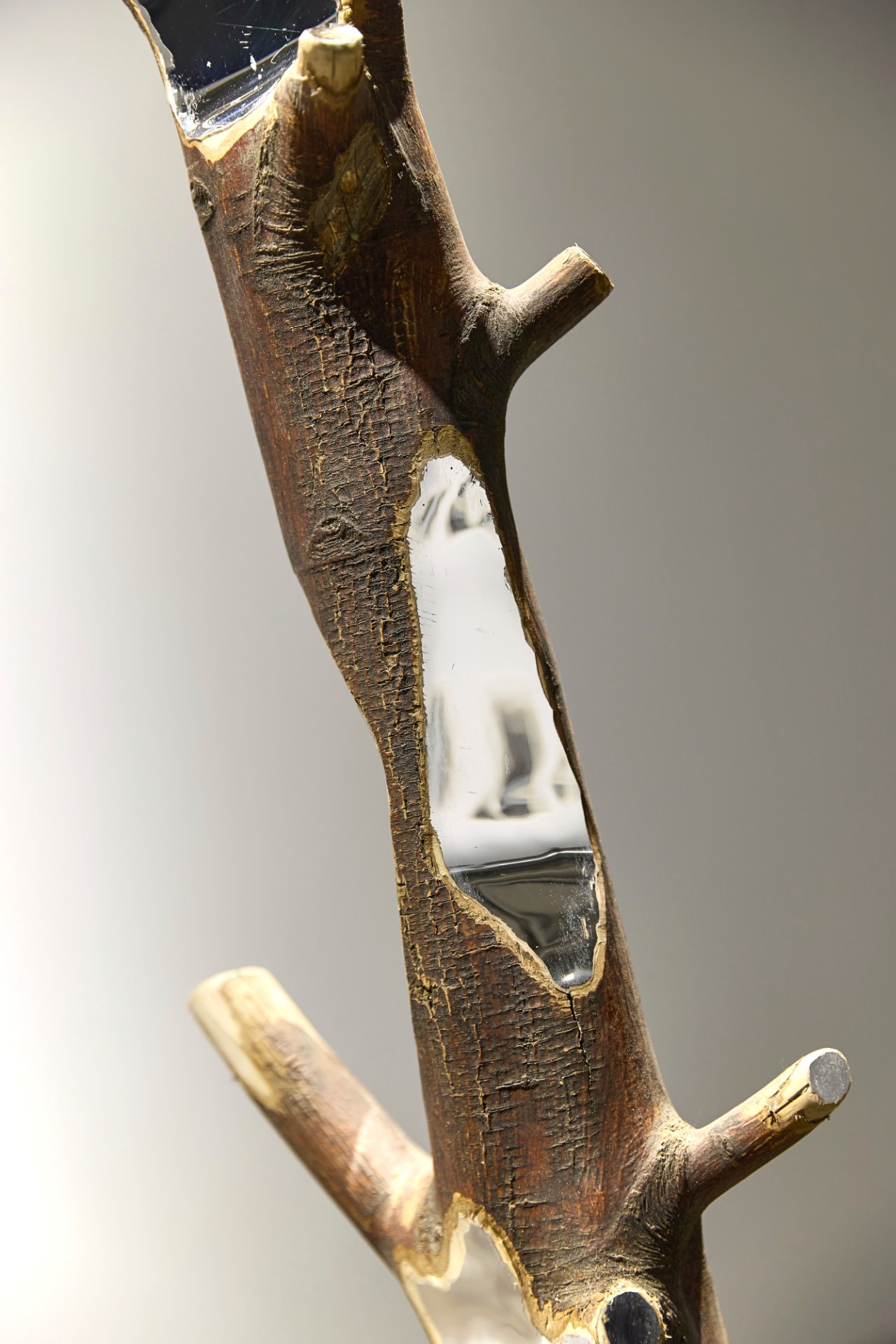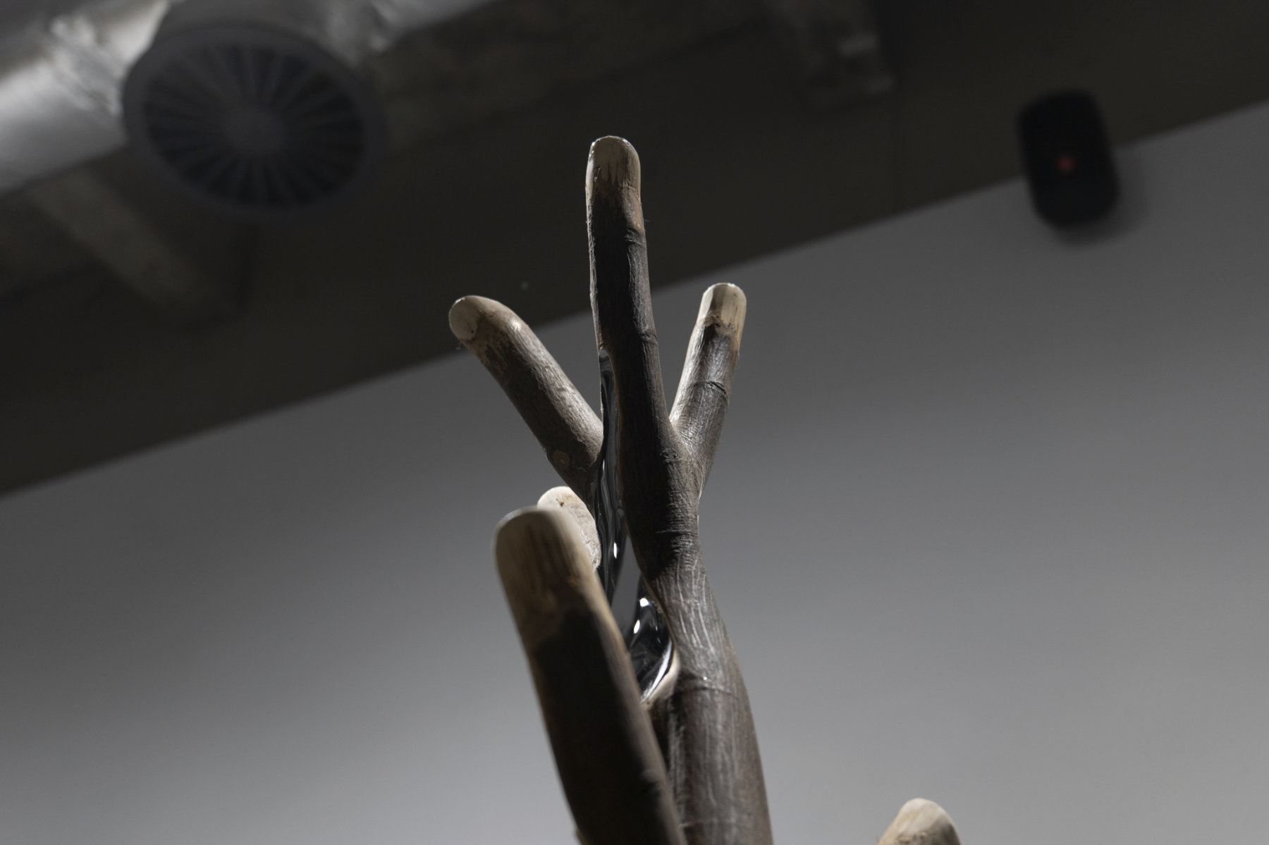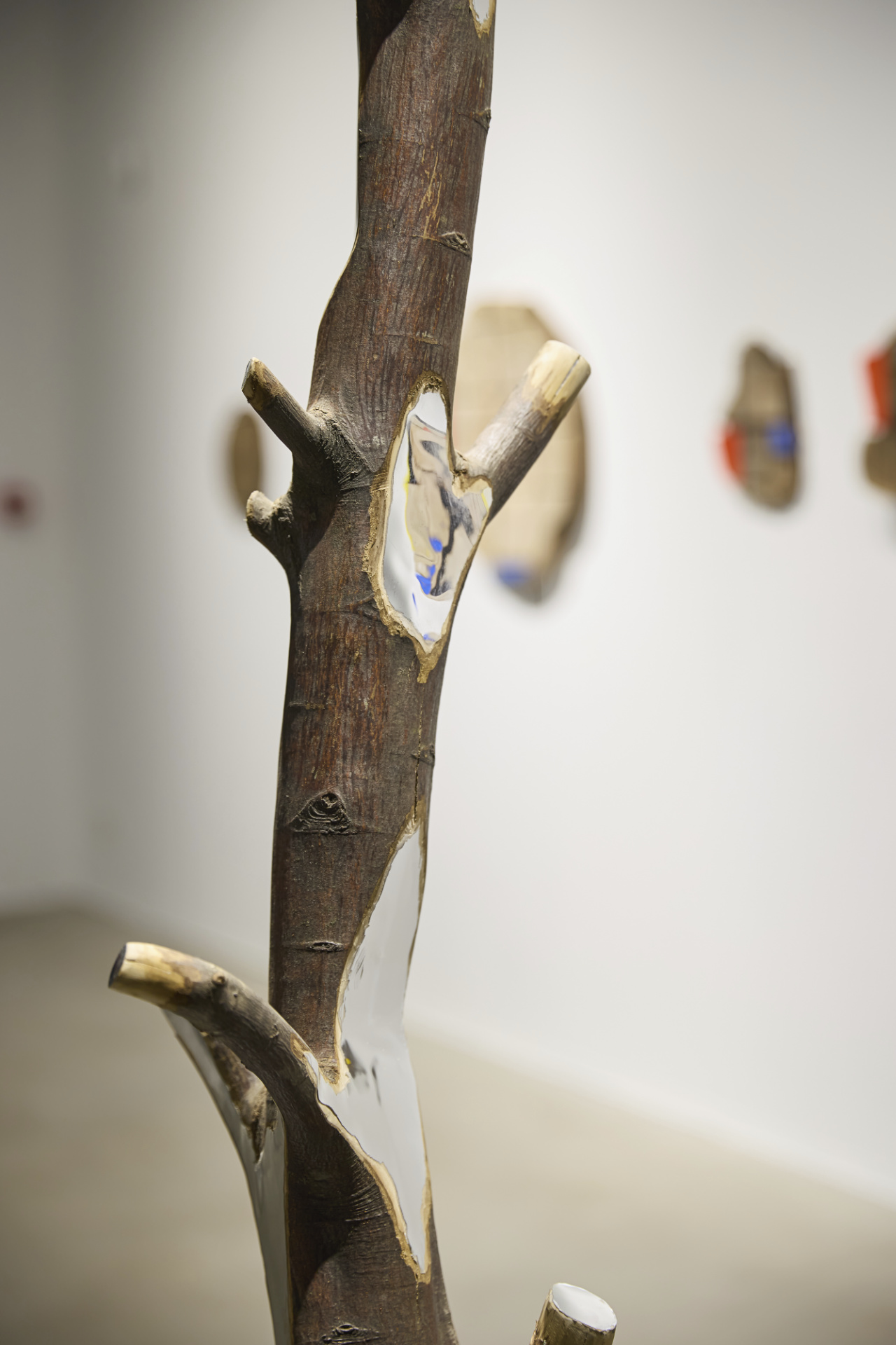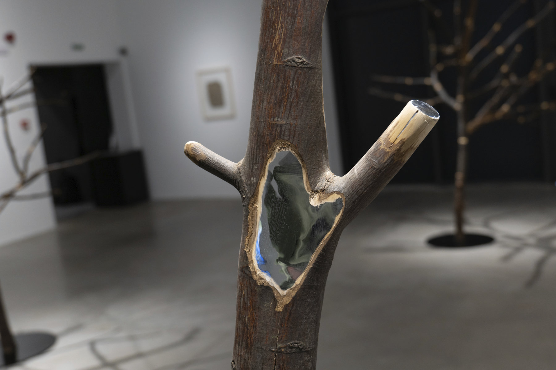 The tree is the central figure of the exhibition — materially, symbolically, and conceptually. The trunks brought into the gallery undergo gestures of decomposing, reassembling, and transformation that reveal the tension between the organic and the cultural regimes of structuring. One tree, chopped into firewood and reassembled with slight displacements, visualizes the interruption and reordering of natural growth and form. Another, shaped and polished into a mirror-like surface, turns the organic trunk into a site where the viewer literally sees themselves — a meeting point between nature and representation, between body and image.