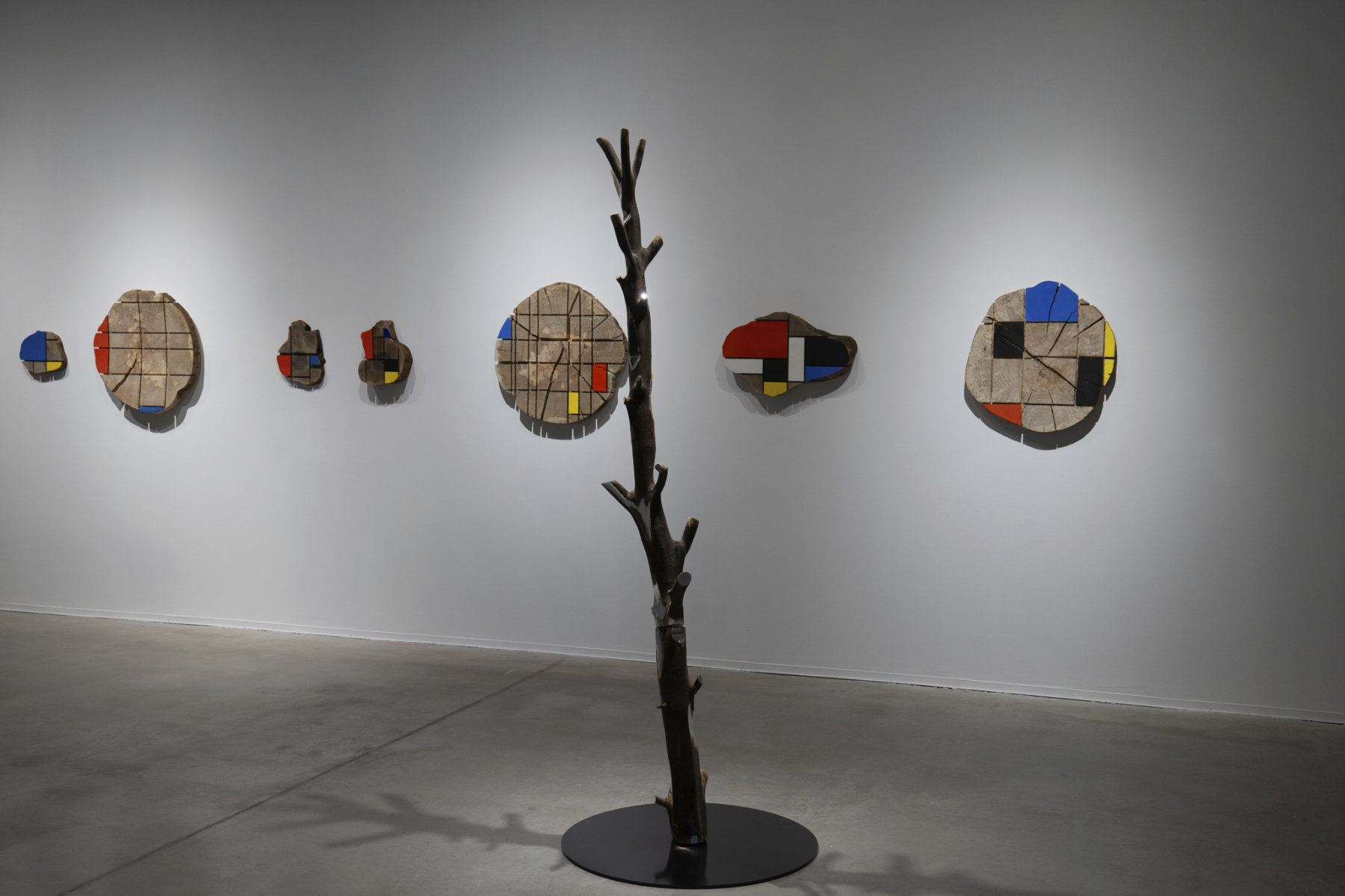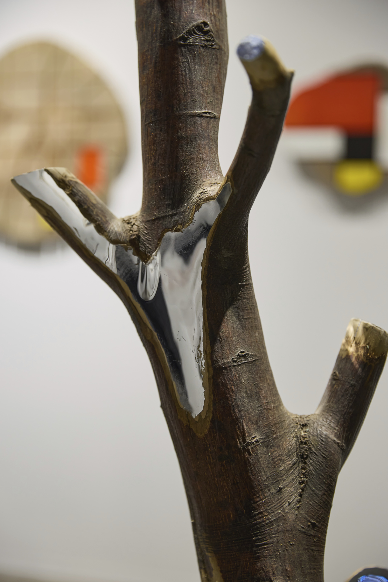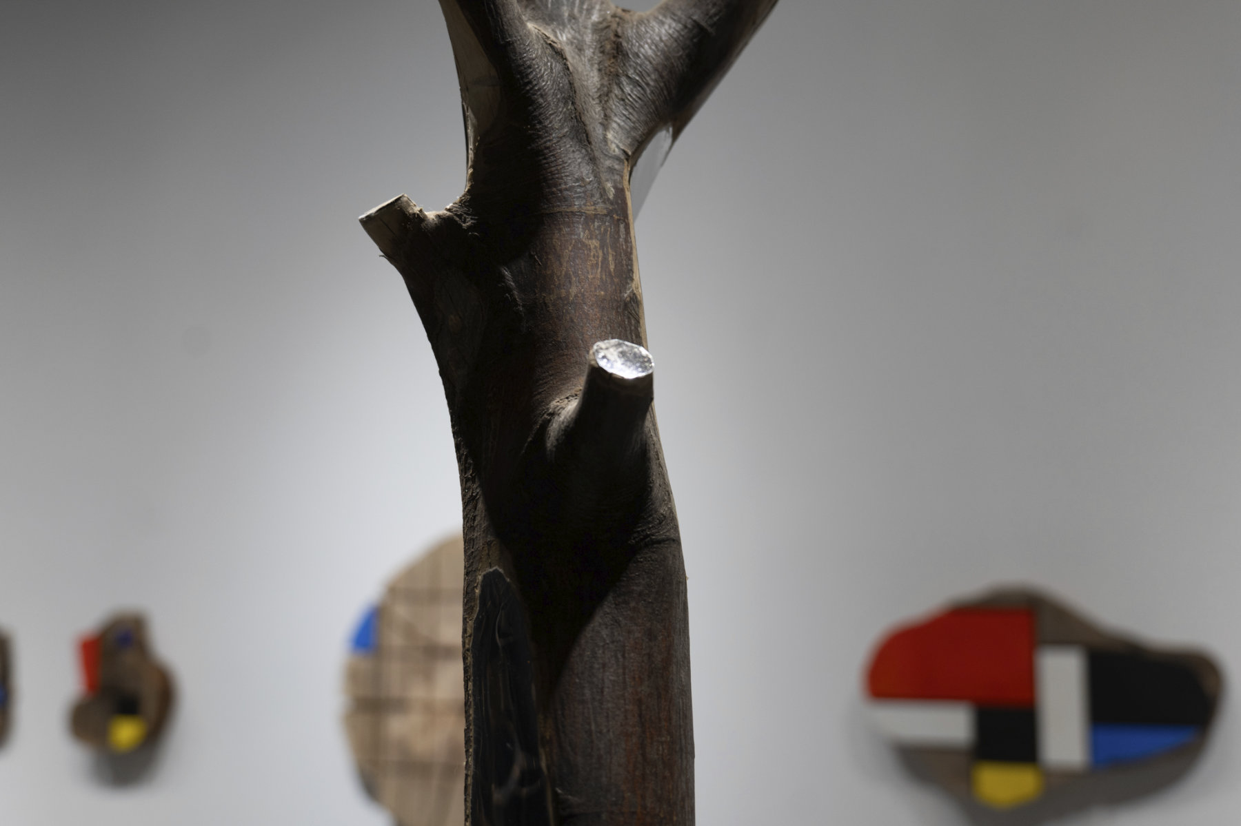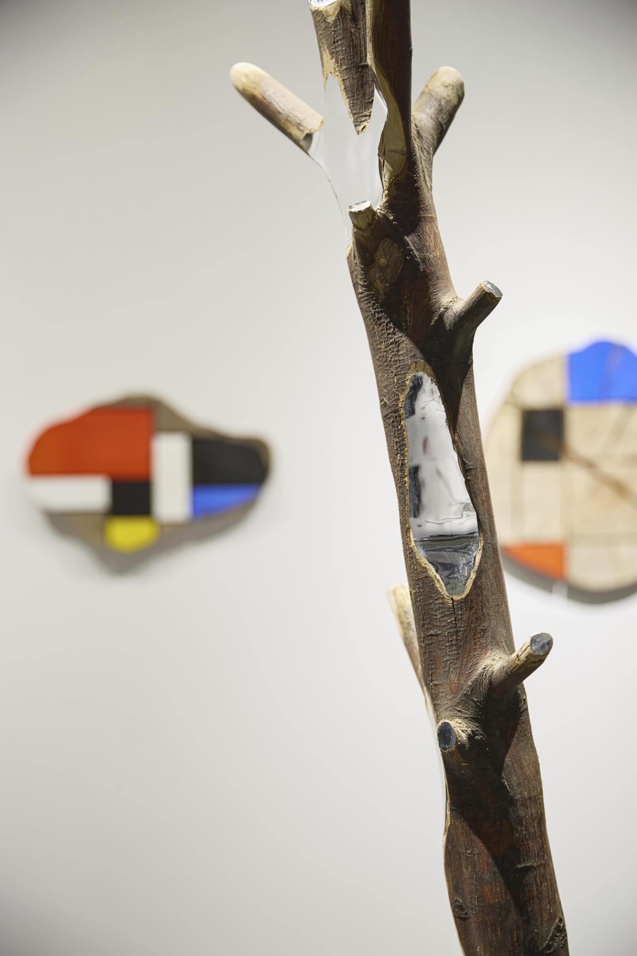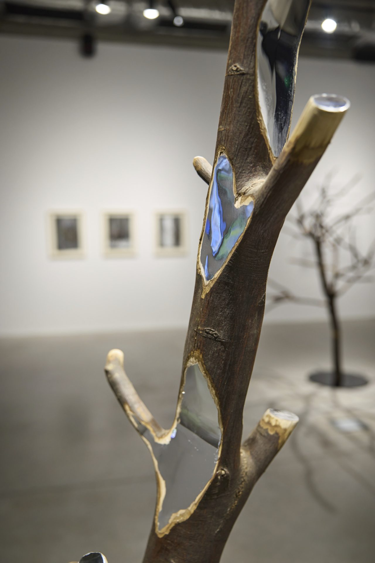 The tree is the central figure of the exhibition — materially, symbolically, and conceptually. The trunks brought into the gallery undergo gestures of decomposing, reassembling, and transformation that reveal the tension between the organic and the cultural regimes of structuring. One tree, chopped into firewood and reassembled with slight displacements, visualizes the interruption and reordering of natural growth and form. Another, shaped and polished into a mirror-like surface, turns the organic trunk into a site where the viewer literally sees themselves — a meeting point between nature and representation, between body and image.