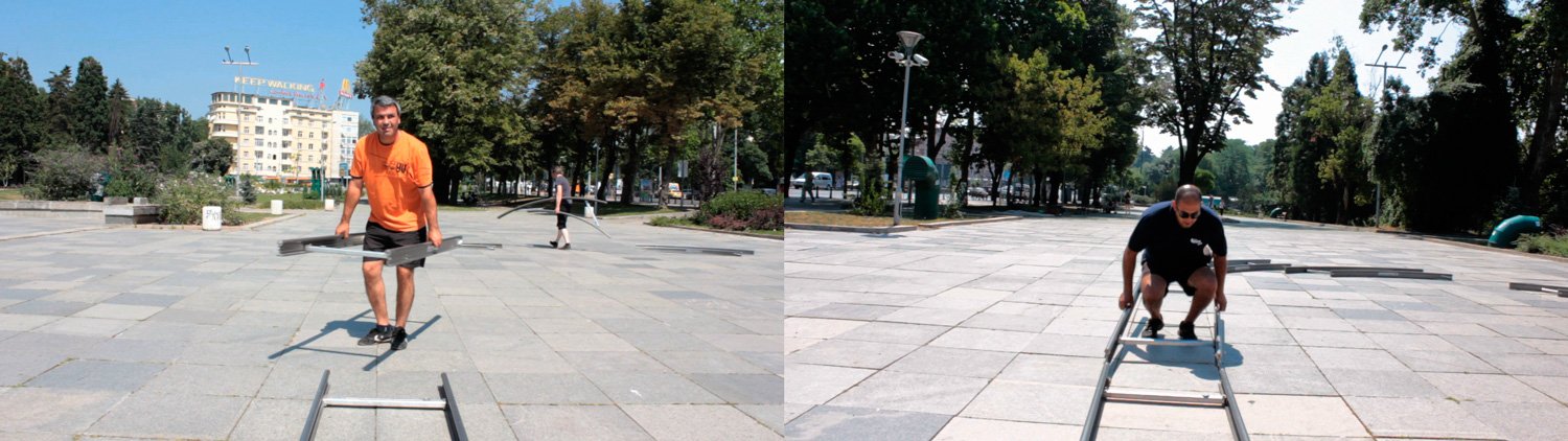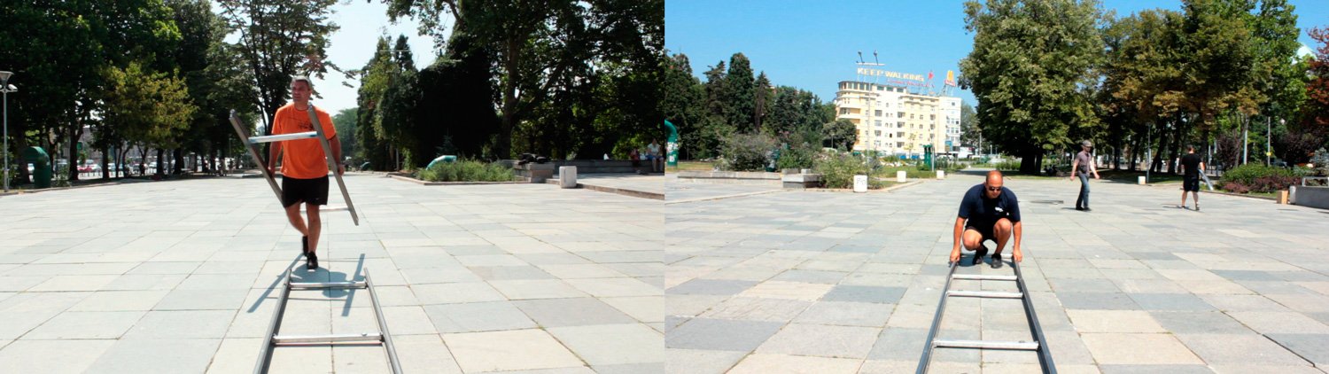 Двете камери документират усилията на екипа по монтаж (пред) и демонтаж (зад платформата) на модулните релси на фона на сменящата се околна градска среда и случайни минувачи.