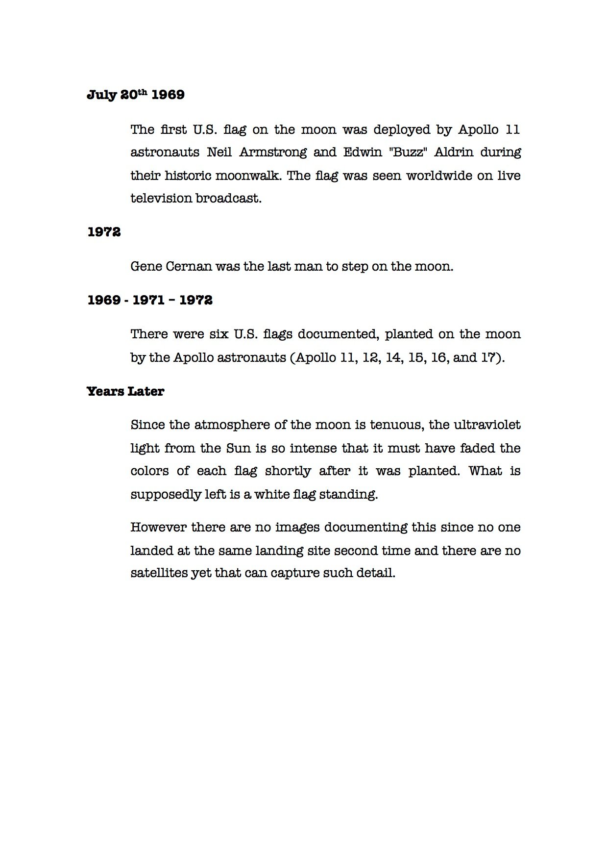 Тъй като атмосферата на луната е оскъдна, ултравиолетовата светлина идваща от слънцето е толкова интензивна, че цветовете на флага най-вероятно са избледнели за много кратък период от време. Така остананките от всеки от шестте грандиозни жеста на победа са един неподвижен бял флаг до пълната дезинтеграция на материята му. Този образ разбира се не е документиран, тъй като никой не се е приземил на същото място повторно и все още няма сателити които са способни да уловят такъв детайл.