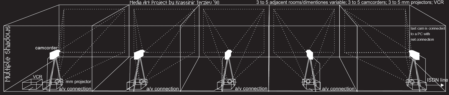 The installation consists of 6 layers/ 5 adjacent rooms. Room 1. Projection on the wall - video loop: a peaceful landscape, panorama, and the figure of a man (the author) standing with his back to the audience. Silence. The figure turns slowly to face the audience and says, "Don't look at me. The camera is working. Don't stand like that." On the wall opposite the projection a surveillance camera is installed (the parameter of the vision is that of the wall projection). The camera transmits the image of the visitors in front of the projection (landscape) to the next room on a video-beam projection on the wall. There is another surveillance camera installed in the Room 2 opposite the wall projection that transmits the vision of Room 2 to the next room and so on and so on. Till Room 5. In this way the images are layered one over the other so the visitor from the first room is already a projection on the wall of the 2nd room but in the 3rd he is a projection of a projection and in the last image it is not clear any more where the people in the image come from, who is watching who, what is the original, and where multiplicity begins. The last image is transmitted on the Internet site - a simulation of a police line-up - accompanied with a text: "Point him out. Don't worry - they can't see you."