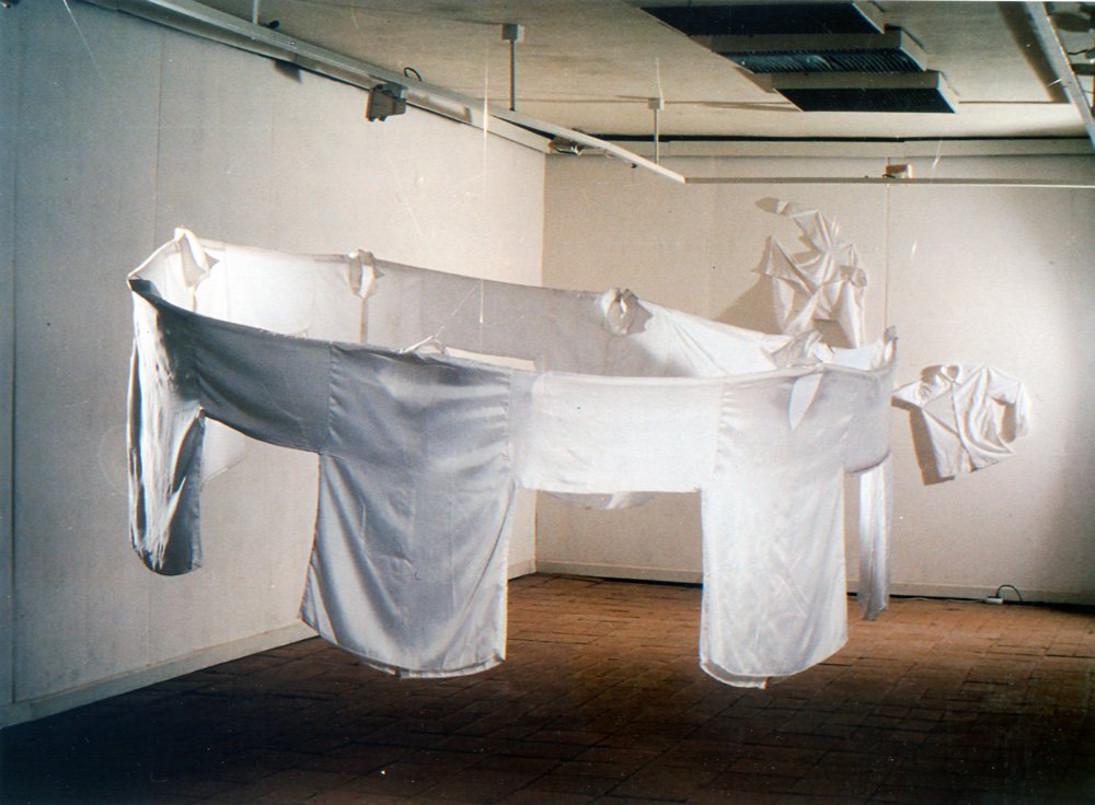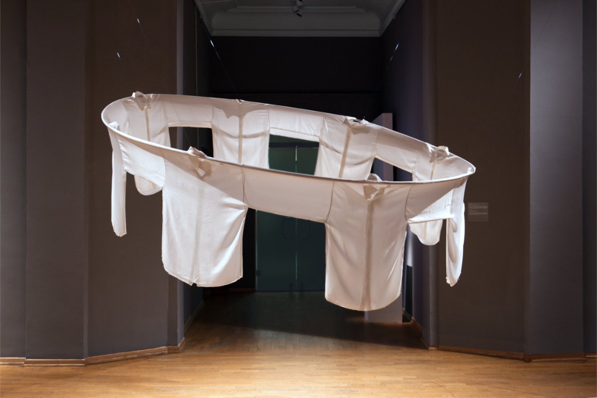 Let's Dance utilizes a technique from the craft of cloths design. The 10 white shirst presented in the installation are sewed with one sleeve serving two adjacent shirts, leaving no individual space for movement outside of the circular group. The group that dances on the accompaniment of a small portable cassette player, playing traditional Bulgarian (semi-ritual) dance music "Horo".