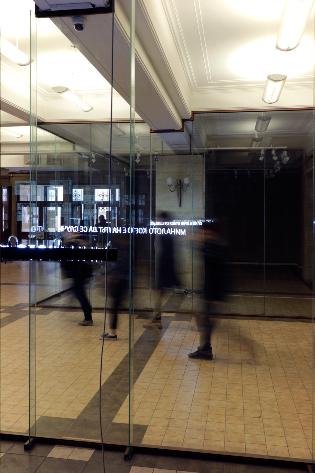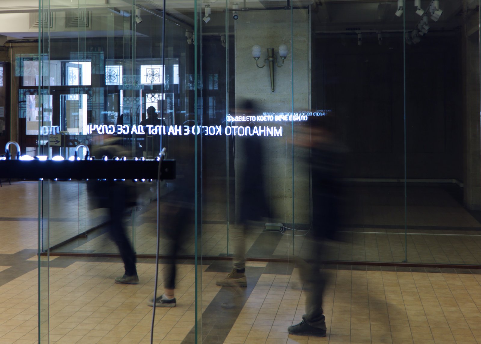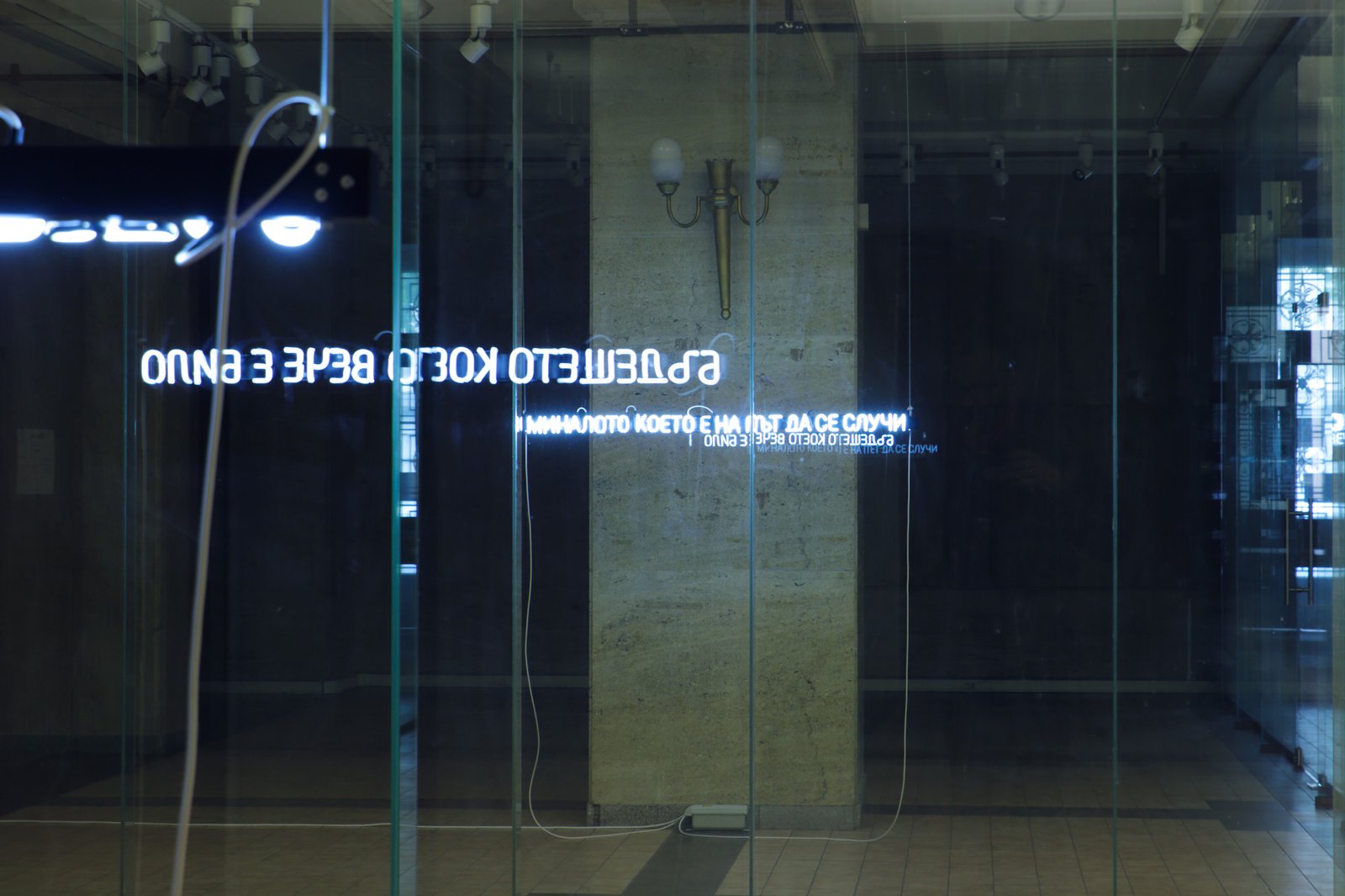 Този опит за настоящето е синтезиран от него в изречението „Между миналото, което предстои и бъдещето, което вече е било“, разделено на две части и изписано с големи неонови букви в двата стъклени куба на галерия Алма Матер. Студентите, преподавателите, служителите и посетителите на Софийския университет ще преминават всекидневно между двете части на тази сентенция, иронично превърната в рекламен надпис, без да могат да я прочетат цялата. В зависимост от посоката на движение, те ще виждат само едната от двете части, а другата ще трябва да довършат сами. Възможно ли е времето отново да се върне в курса си?