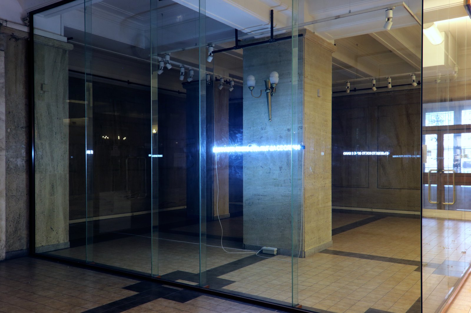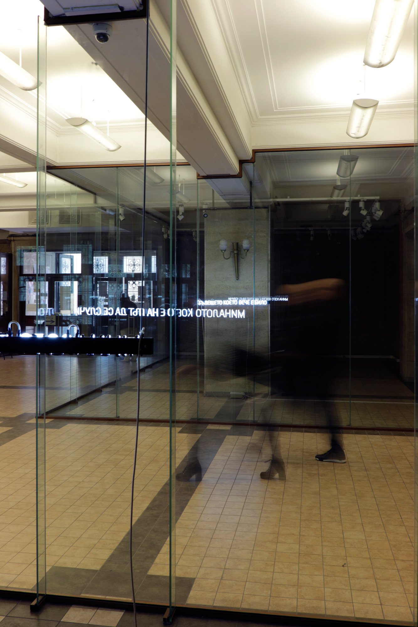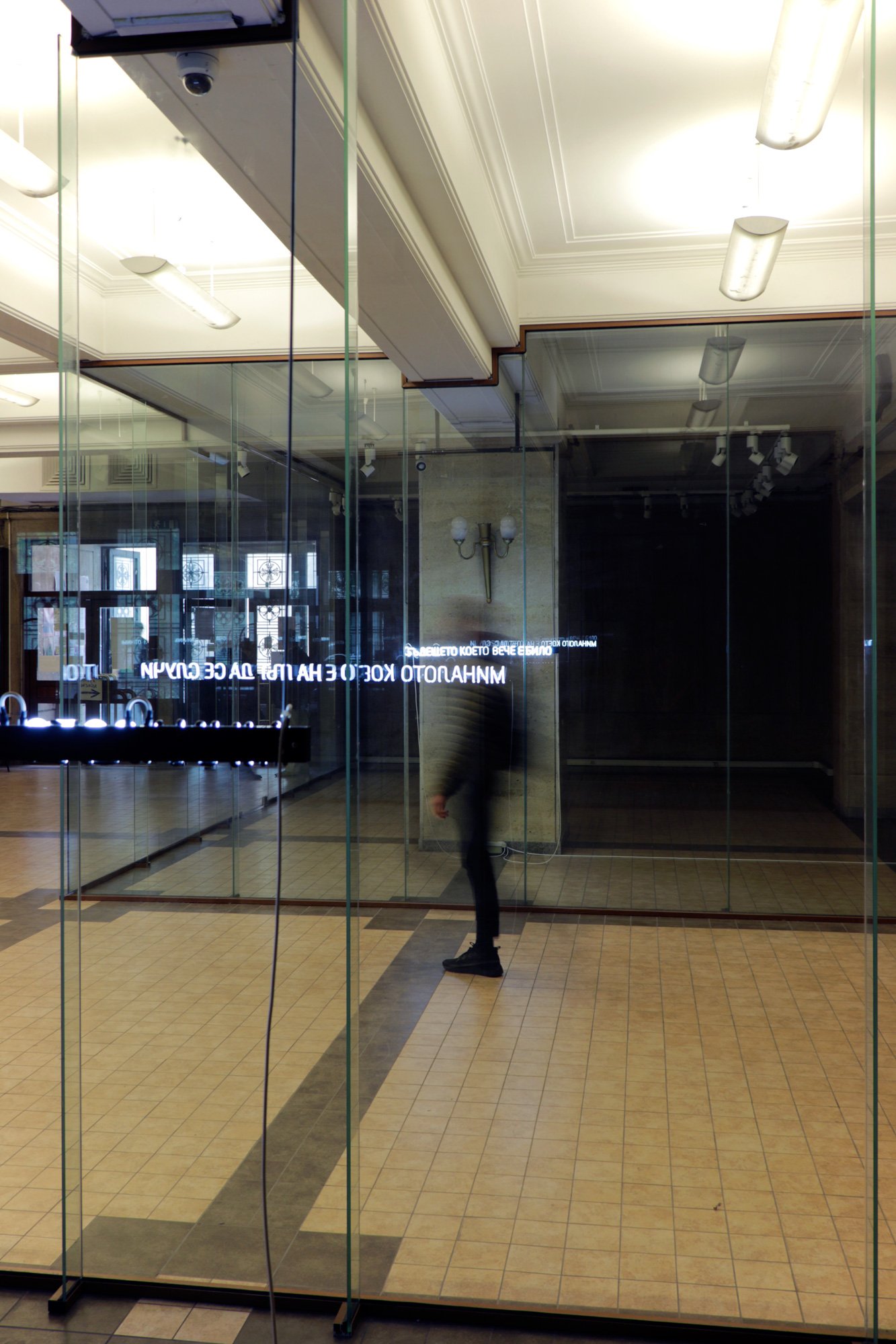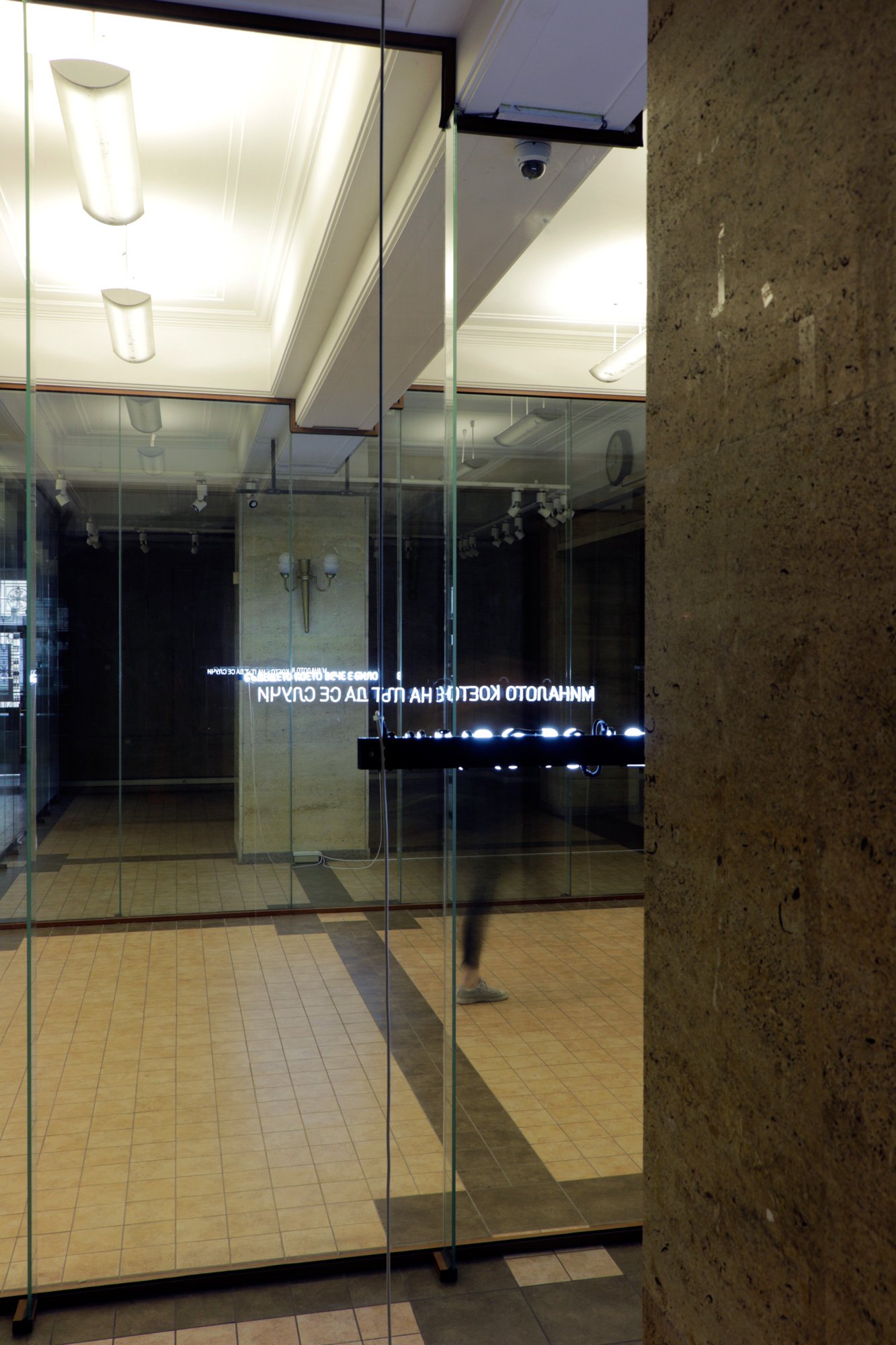 Този опит за настоящето е синтезиран от него в изречението „Между миналото, което предстои и бъдещето, което вече е било“, разделено на две части и изписано с големи неонови букви в двата стъклени куба на галерия Алма Матер. Студентите, преподавателите, служителите и посетителите на Софийския университет ще преминават всекидневно между двете части на тази сентенция, иронично превърната в рекламен надпис, без да могат да я прочетат цялата. В зависимост от посоката на движение, те ще виждат само едната от двете части, а другата ще трябва да довършат сами. Възможно ли е времето отново да се върне в курса си?