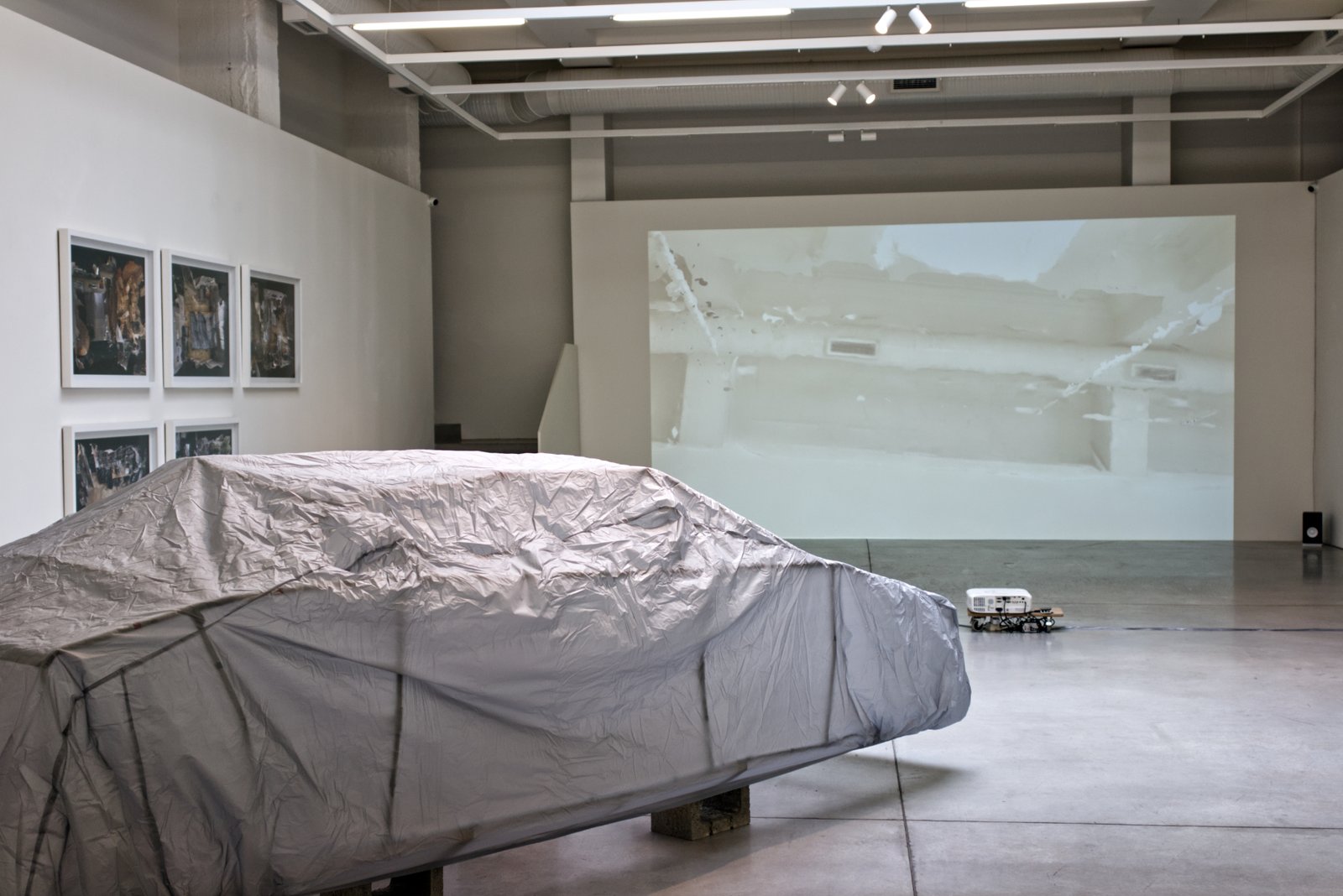 Multiple object-images are envelopes without density and refer to the specificities of material and phantasmal space, to doubles, déjà vu, mirages and ghosts. The exhibition features a car cover that covers the absence of a car. Sofia’s street lighting performs a club rhythm. The door of a train car opens and closes automatically without any moving figures being visible to provoke this. A clock performs a looped “dance” of a few seconds.