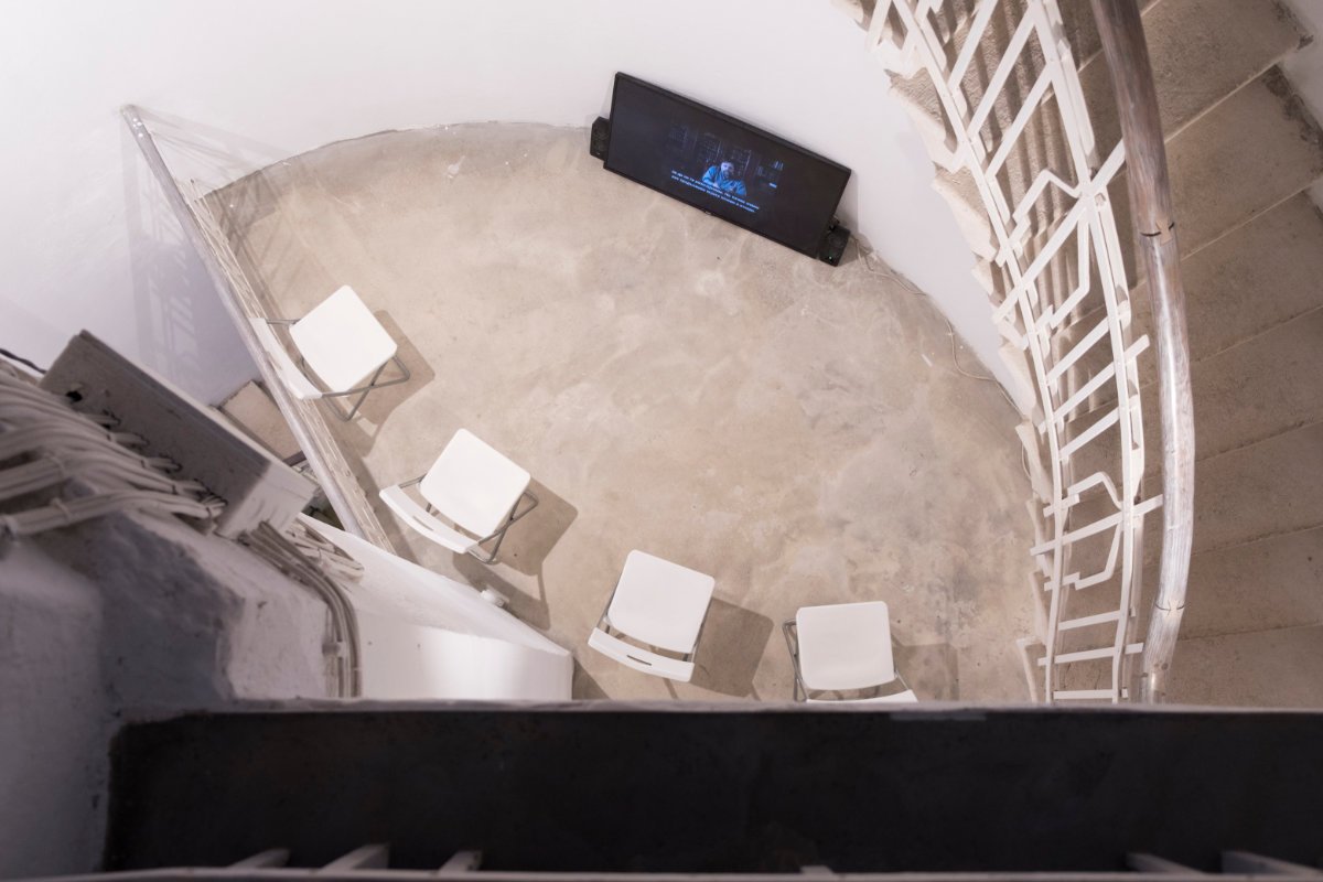 The exhibition includes entirely new works made with the specific space of the water tower in mind, where the corners of the white cube are shifted by the radius and spiral of constant descent and ascent, and the original functions of a technical facility have given way to the aesthetic effects of this type of strange architecture that is no longer associated with the movement of water but with the movement of images instead.