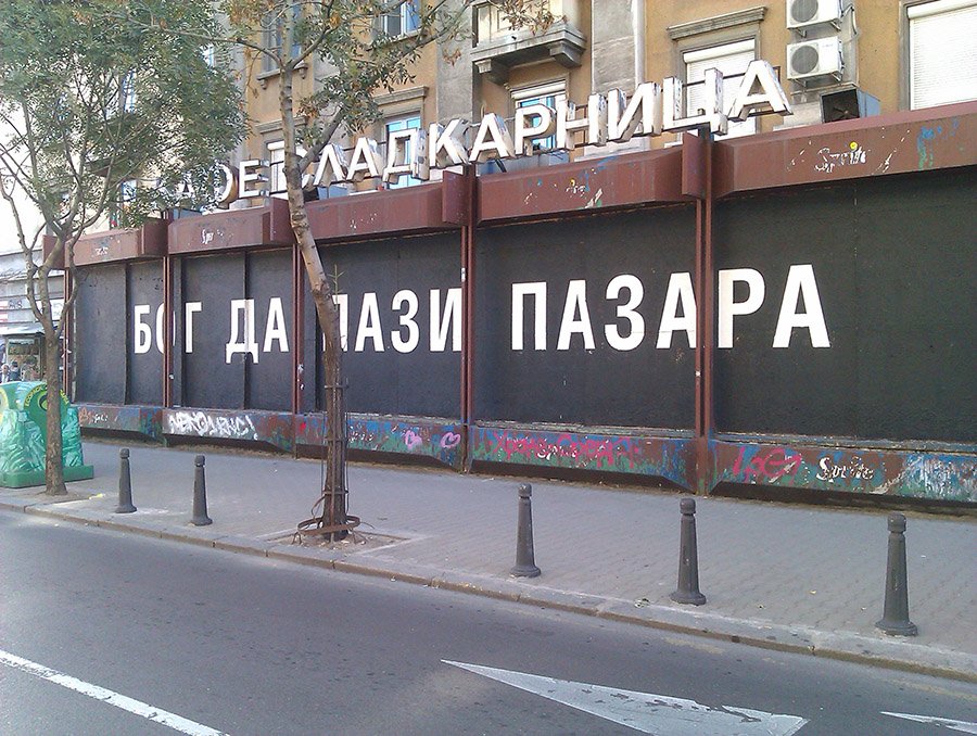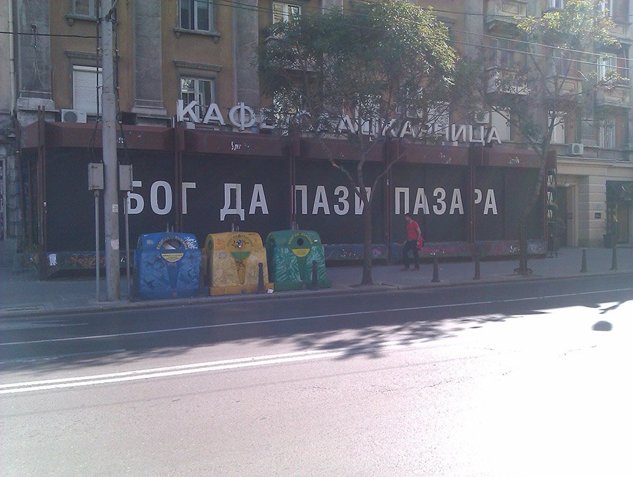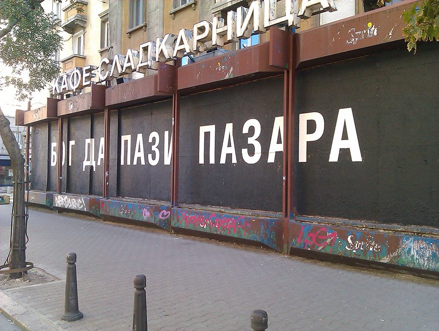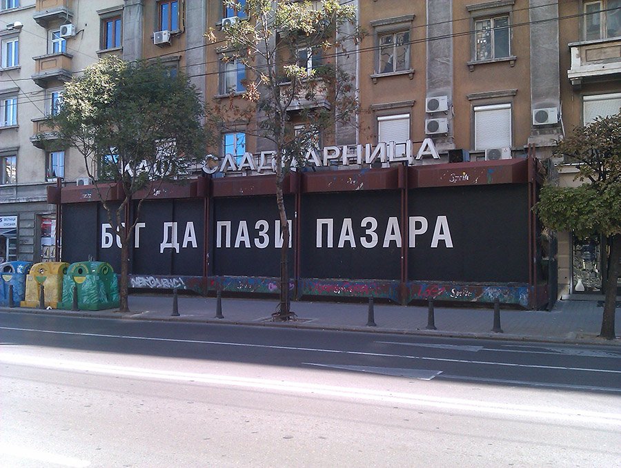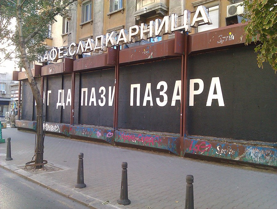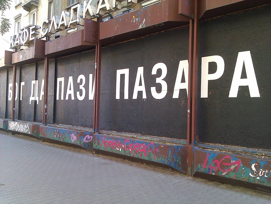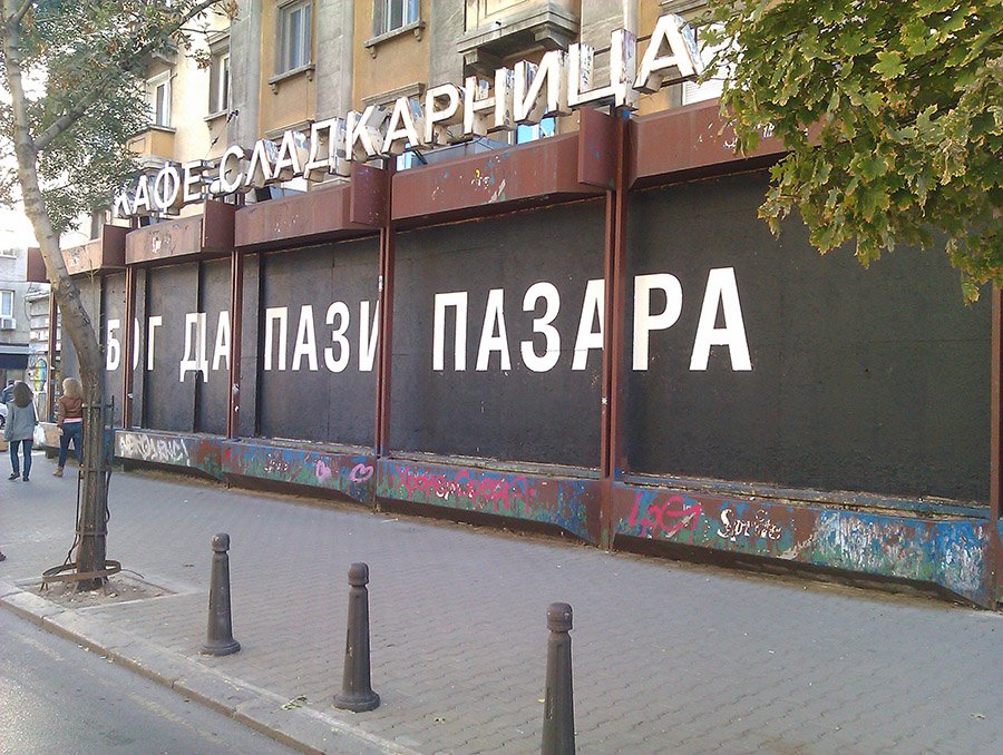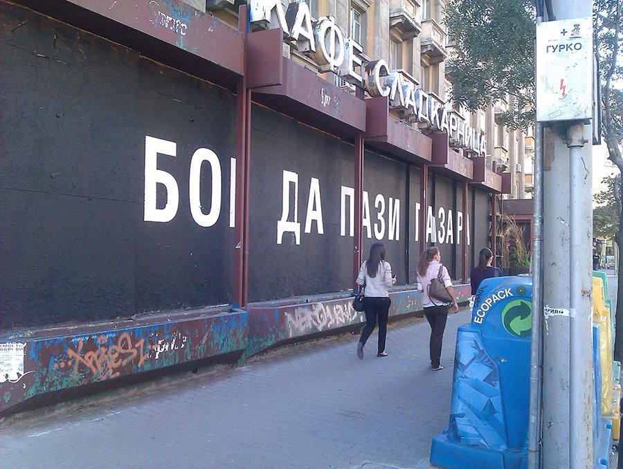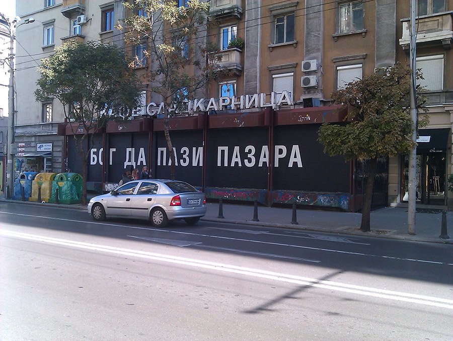 The intervention in public space God save... is a white text stenciled on the black background of the facade of an abandoned restaurant in the center of Sofia. The text reads "God save the Market". The work is part of series placing a critique of the Global Financial and Economic cryses from 2008-2012, the market crash that played an apotheosis of the Neoliberal turn as fars.