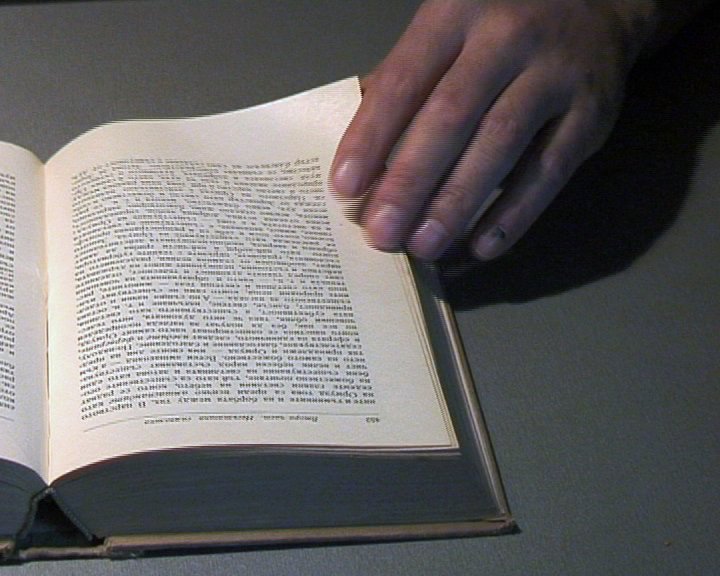 Close up of hands flipping the pages of the book simultaneously: the right hand flipping the book sheets left to right, the left hand listing the book right to left.