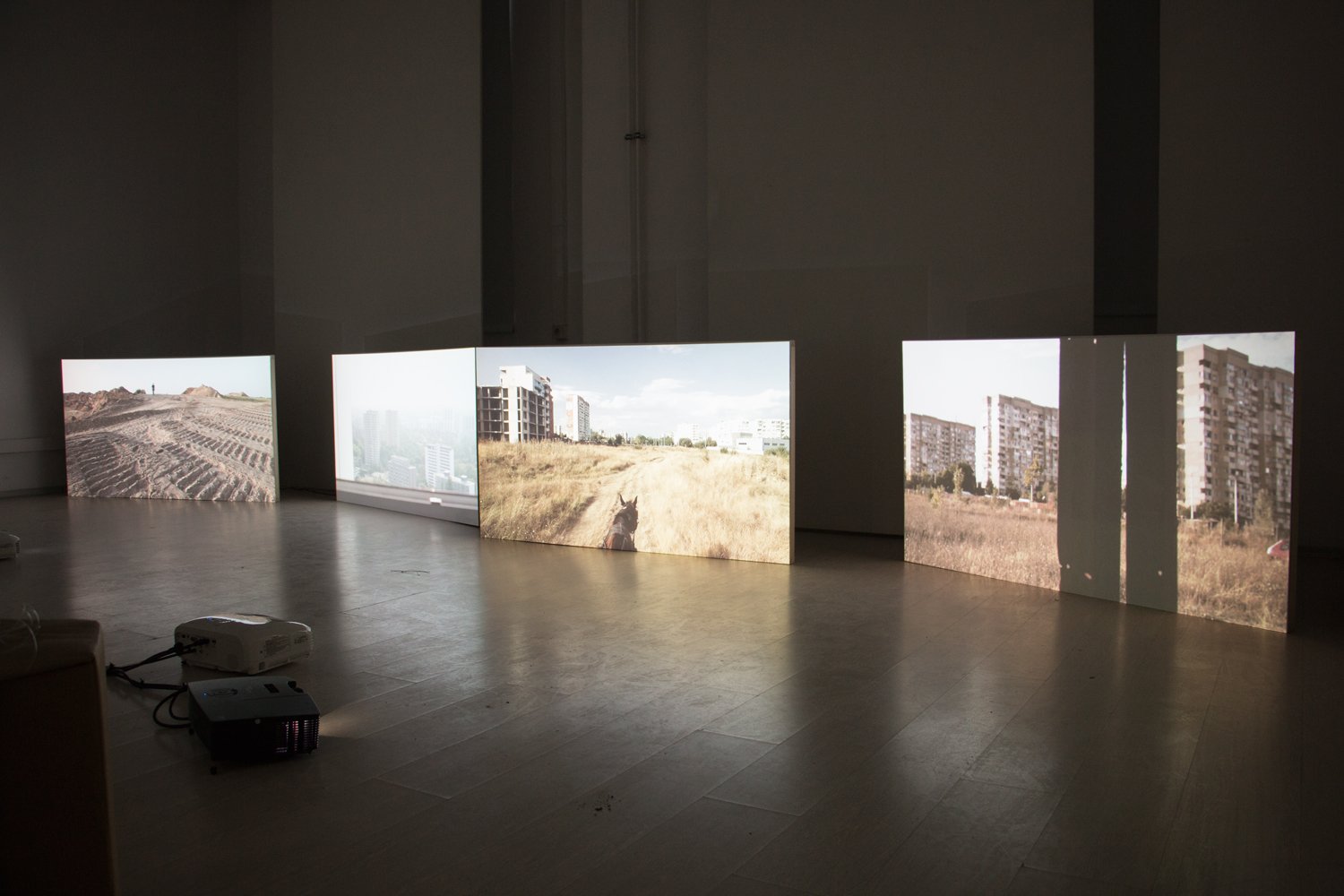 Right on the line between development and fallow land stands an abandoned Budka. Those informal, temporary constructions are a product of the economic vacuum of the post socialist era, their existence as spaces for informal economy was long ago threatened and replaced by formal economy and malls. In that sense the small Budka mirrors the enormous abandoned construction site of a new shopping mall a couple of hundred metres further down the road. The Budka at the edge of the Rosalin park’s parking lot was set aside years ago, in order to observe from there the construction work and to secure the peripheral location. It burned down a long time ago and is used today only by the children of a Roma family as a playground, as the camera retraces the panopticon of socialist apartment blocks, neo-capitalistic housing and the free view of the nature.