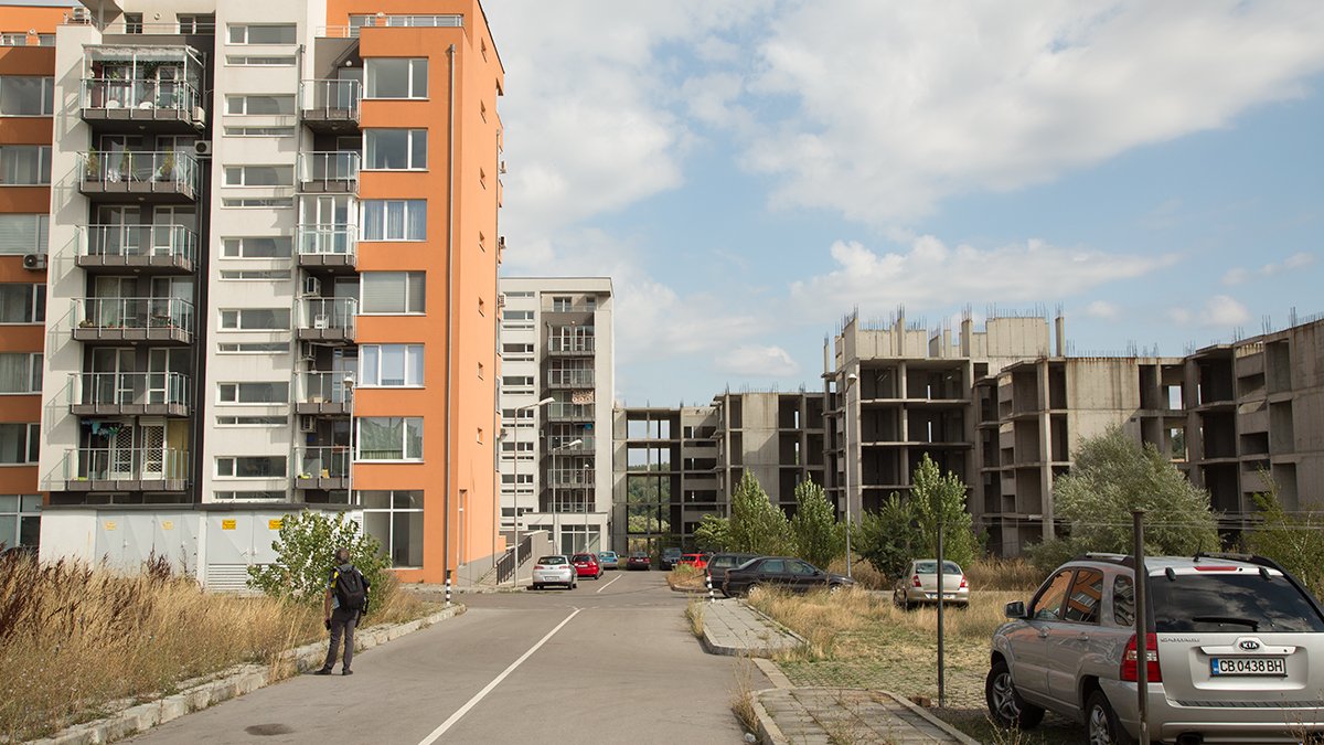 According to the construction plan for Lyulin, the free space between the new and the old town should have been filled with spaces for culture and education. When this free space was deregulated as building land after the changes in 1990, partly prestigious apartment buildings for a wealthy target group were built there instead of cultural spaces for the residents of Lyulin. Rosalin park is the only new building project which is located beyond the Peter Dertliev street, the street which separates Lyulin from the adjacent Zapaden Park and the subsequent fallow land marking the final line of the city. In this exposed, extra-urban location the view to the river valley, the hill which gave the name of the district, and the Vitosha mountain is free. But the building ruins of a second apartment block are obstructing the view, the block was never completed. The asphalt road is a dead end, the intended parking lot has been recaptured by the adjoined grassland.