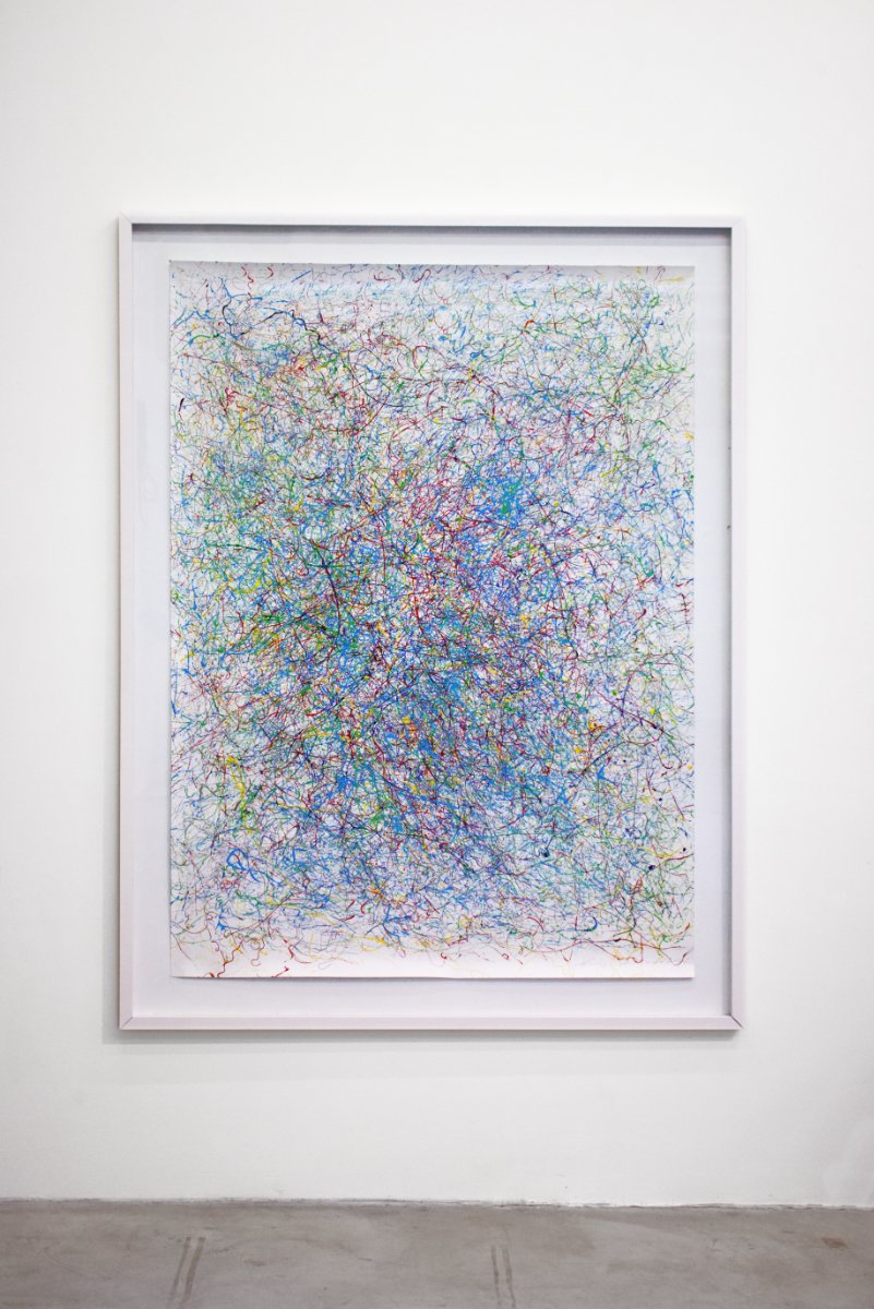 In these works on paper, the image is the result of hundreds of strokes on the paper with a piece of thread soaked in acrylic paint. A map of impulsive movementsin space, but also in time.