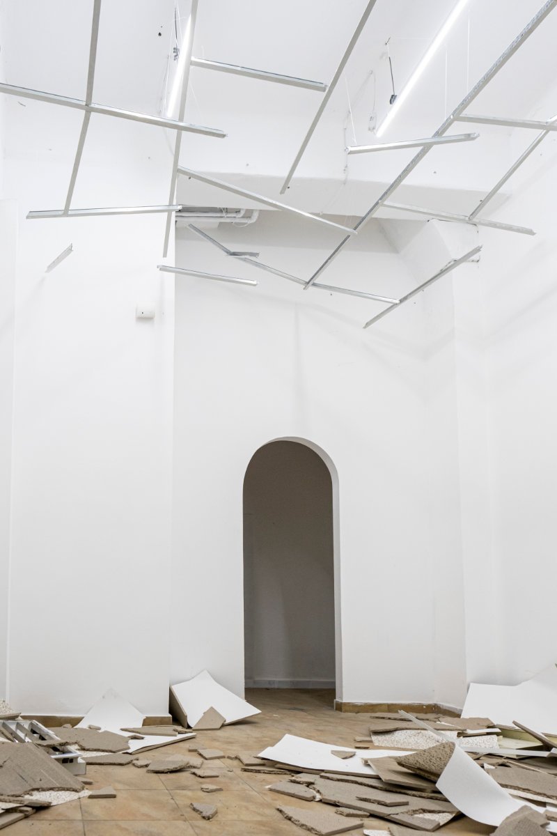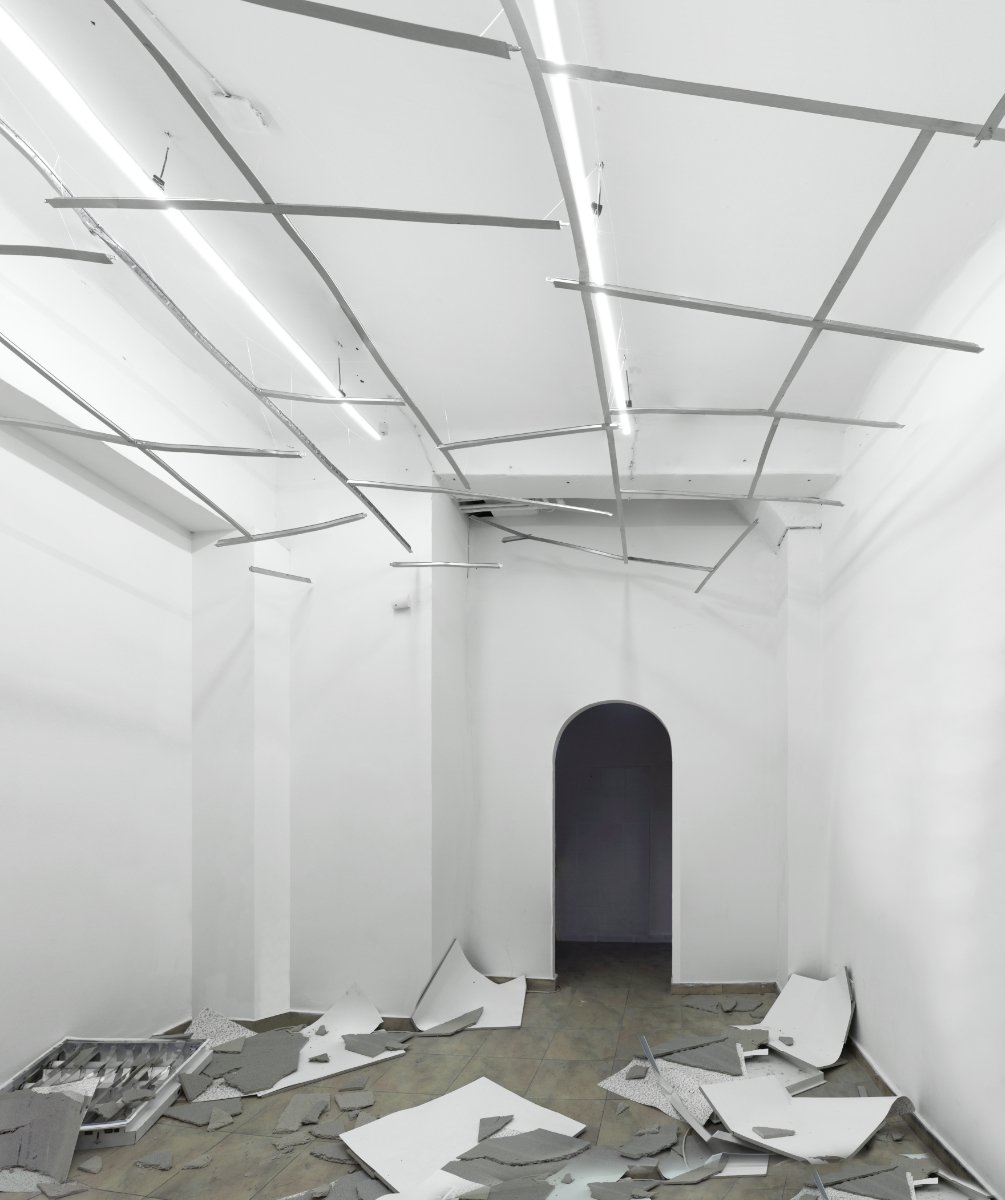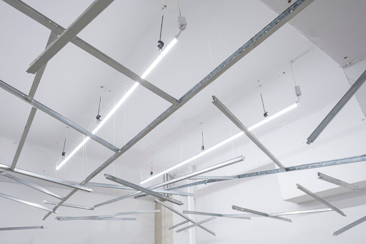 Terziev’s oeuvre reminds us that an artwork has its own logic of space-time continuum, which does not correspond to the terrestrial. It can be chaotic, extended, speeded-up—imagined, and therefore perfect. Because of the way it is constructed, namely through human intent, it represents a segment with a beginning and an end, for comparison with the ray on which we normally slide. This time is different, elsewhere, its parameters still unclear—it is fragile, subject to destruction. Beyond it, there is no continuation; it is situated on planes different from our temporal rays. The artist uses materials that originate in the gallery. Without bringing in anything external, in order to use the resources of the environment and to be mindful of nature beyond, the artist departs from the standard perusal of exhibition activity whereby art is brought in to a white, sterile, temple-like cube. Here, the gallery is both the home to and body of the artistic product. It is spiritualised, but its organs disintegrate—like any other matter over time, in fact.