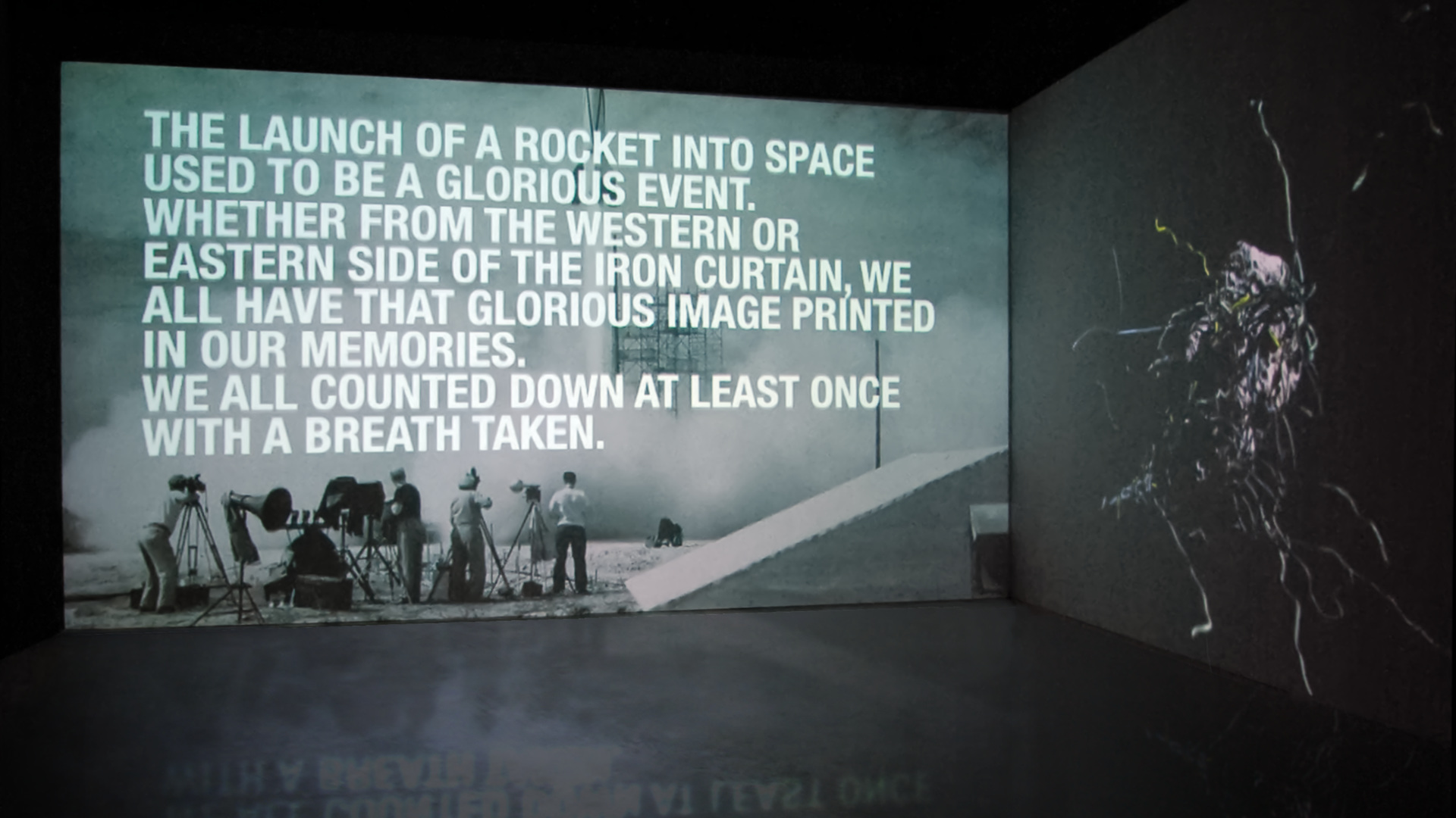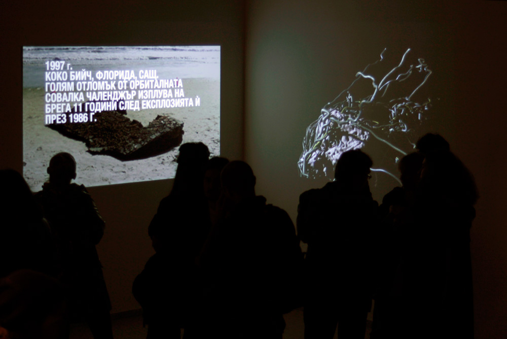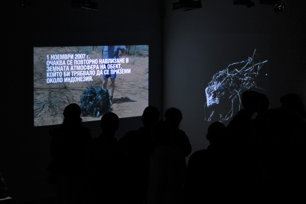 A Message from Space in My Backyard is a two-channel video installation that focuses on the phenomenon of space debris. In the format of а photo-video essay, one channel follows the short history of man in space and the chronology of space junk objects reentering Earth orbit and falling back on the ground at unpredictable moments and places. The facts in the story are layered with excerpts from the brothers Strugatsky science fiction short novel "Roadside Picnic" and other interpretations of the phenomenon. The other channel visualises an imaginary body, half-natural, half-technological, that drifts in space with zero gravity.