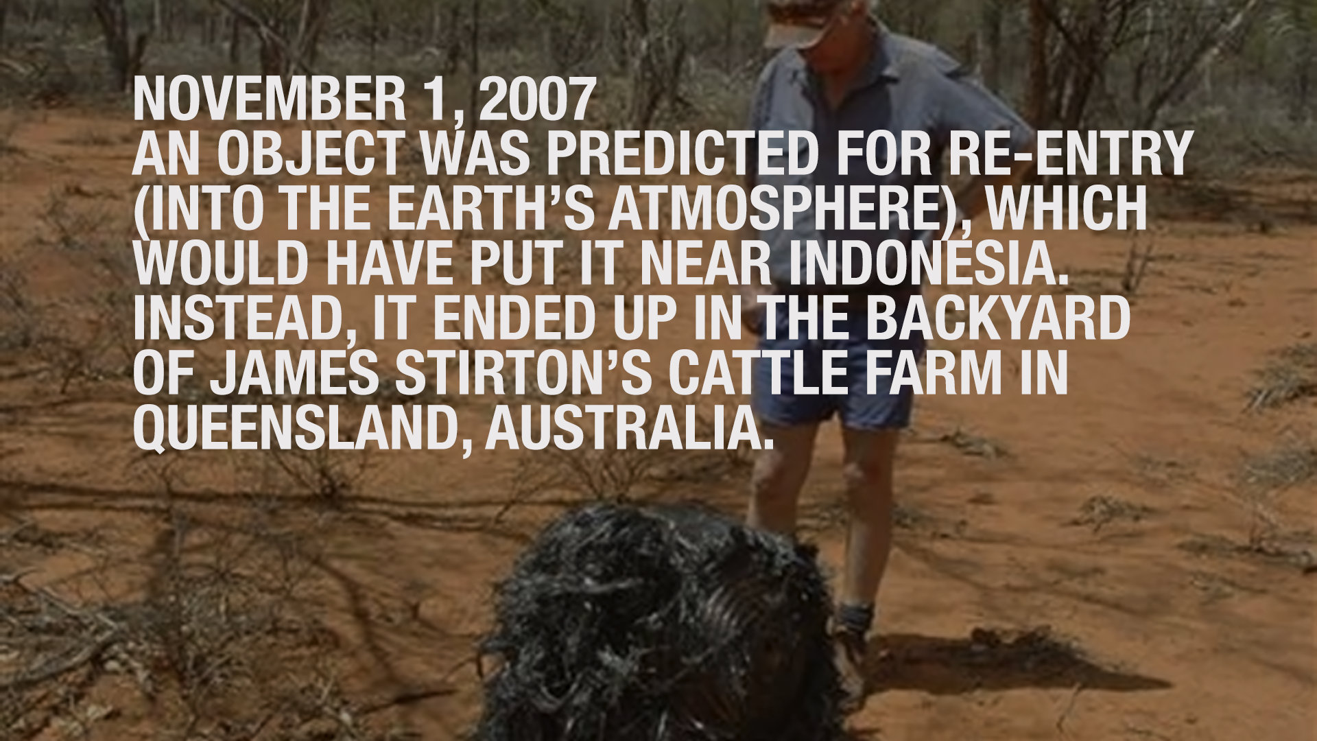 An object was predicted for re-entry (into the Earth’s atmosphere), which would have put it near Indonesia. Instead, it ended up in the backyard of James Stirton’s cattle farm in Queensland, Australia.