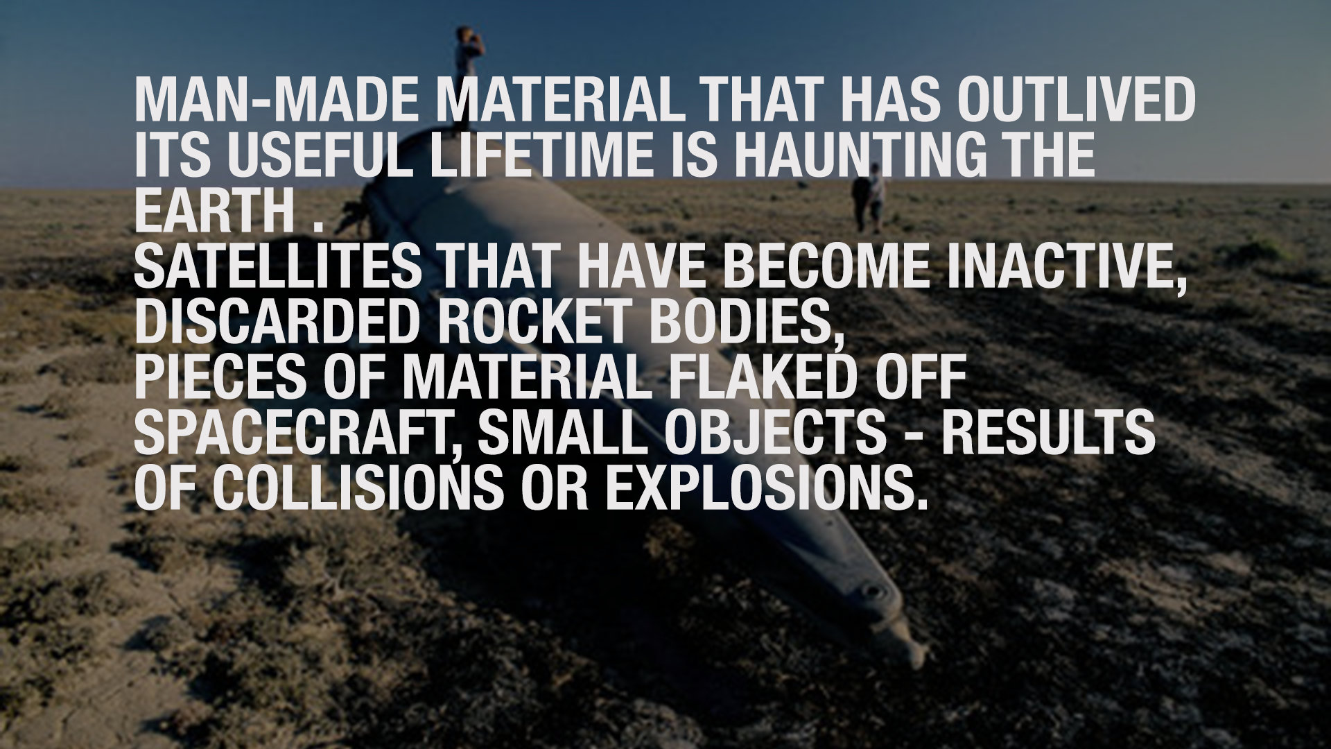 Space debris: man-made material orbiting the earth that has outlived its useful lifetime: satellites that have become inactive; discarded rocket bodies; pieces of material jettisoned or having flaked off spacecraft; small objects that are the results of collisions or explosions.
