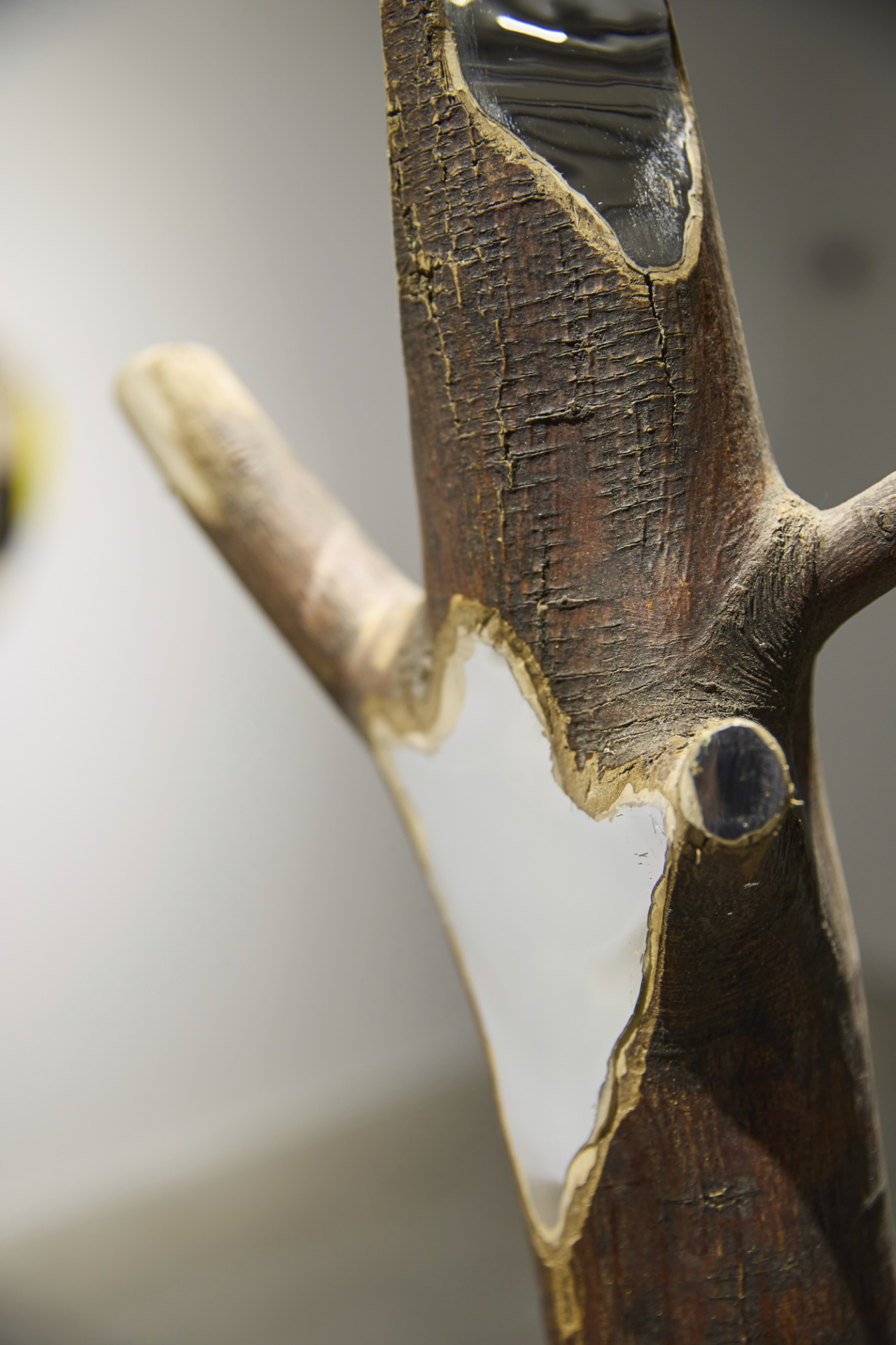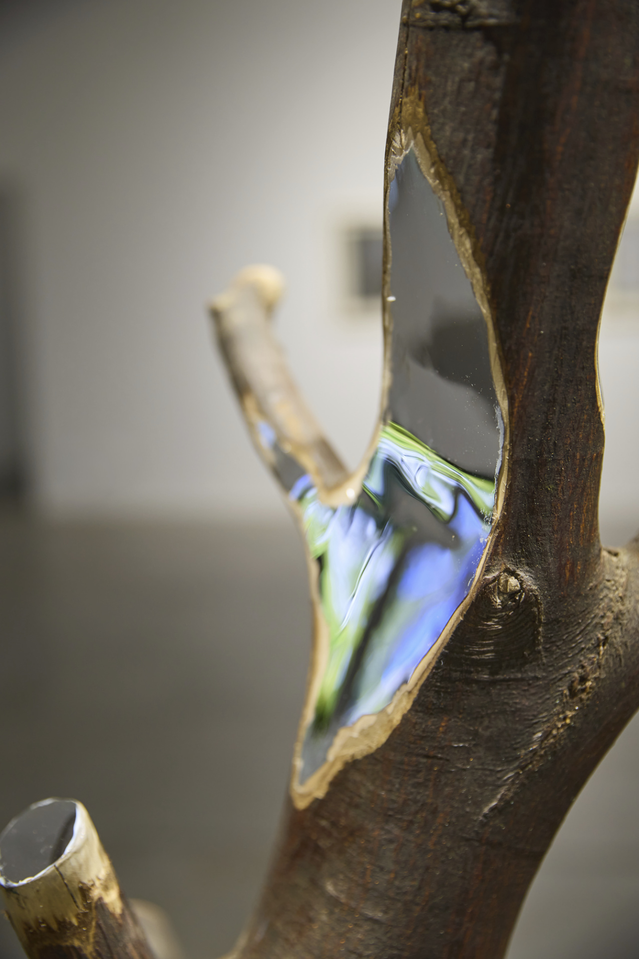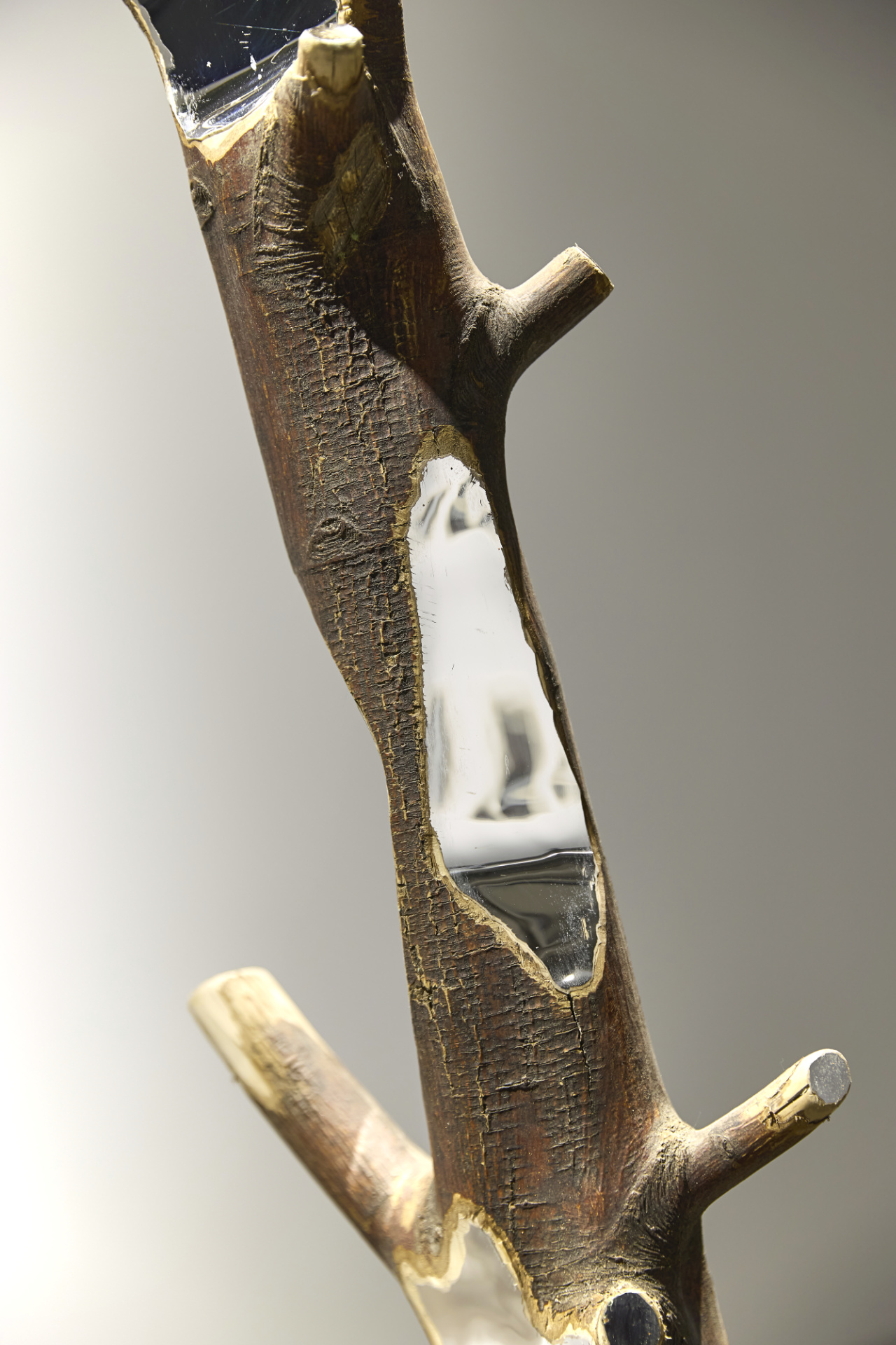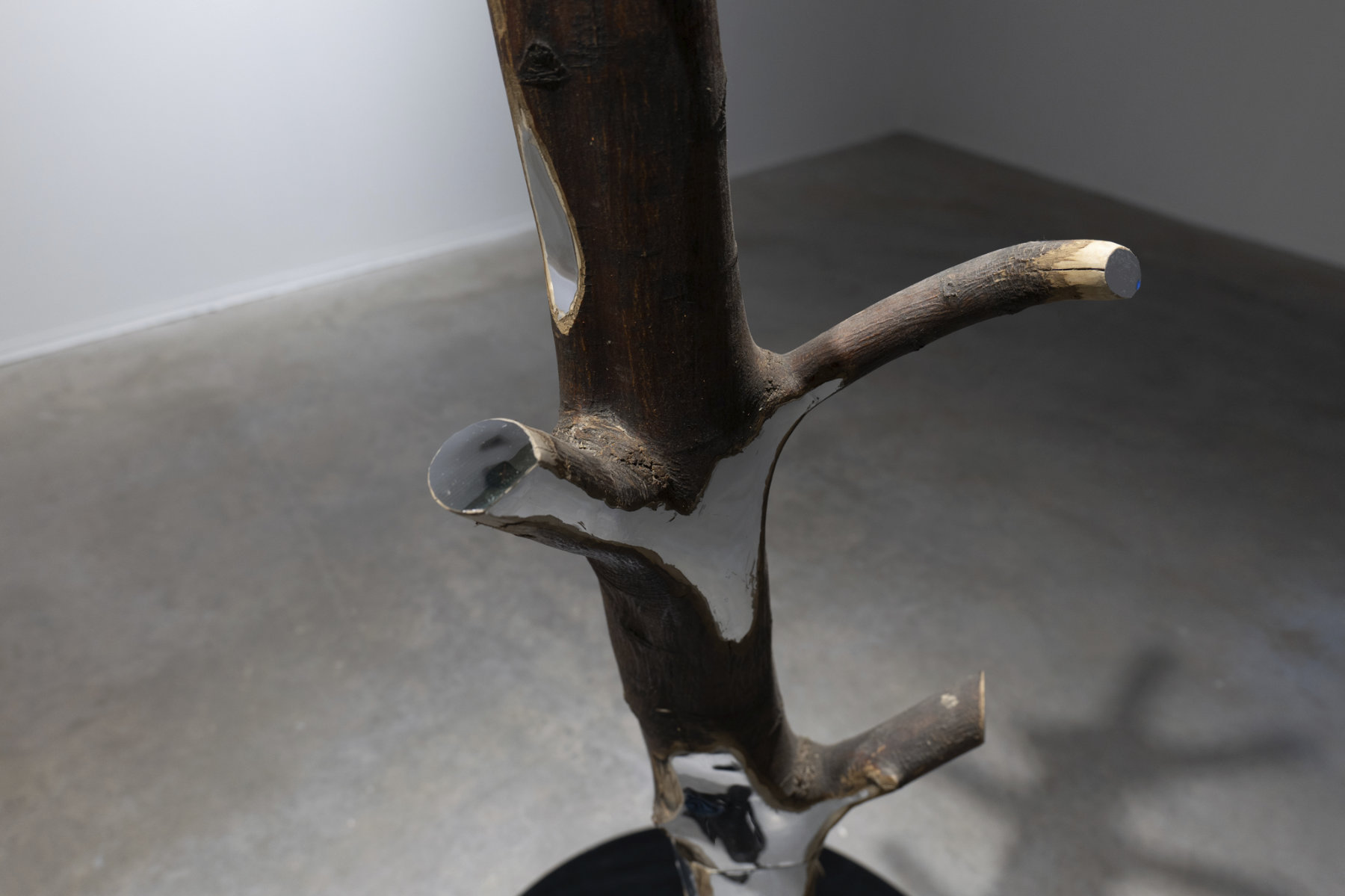 The tree is the central figure of the exhibition — materially, symbolically, and conceptually. The trunks brought into the gallery undergo gestures of decomposing, reassembling, and transformation that reveal the tension between the organic and the cultural regimes of structuring. One tree, chopped into firewood and reassembled with slight displacements, visualizes the interruption and reordering of natural growth and form. Another, shaped and polished into a mirror-like surface, turns the organic trunk into a site where the viewer literally sees themselves — a meeting point between nature and representation, between body and image.