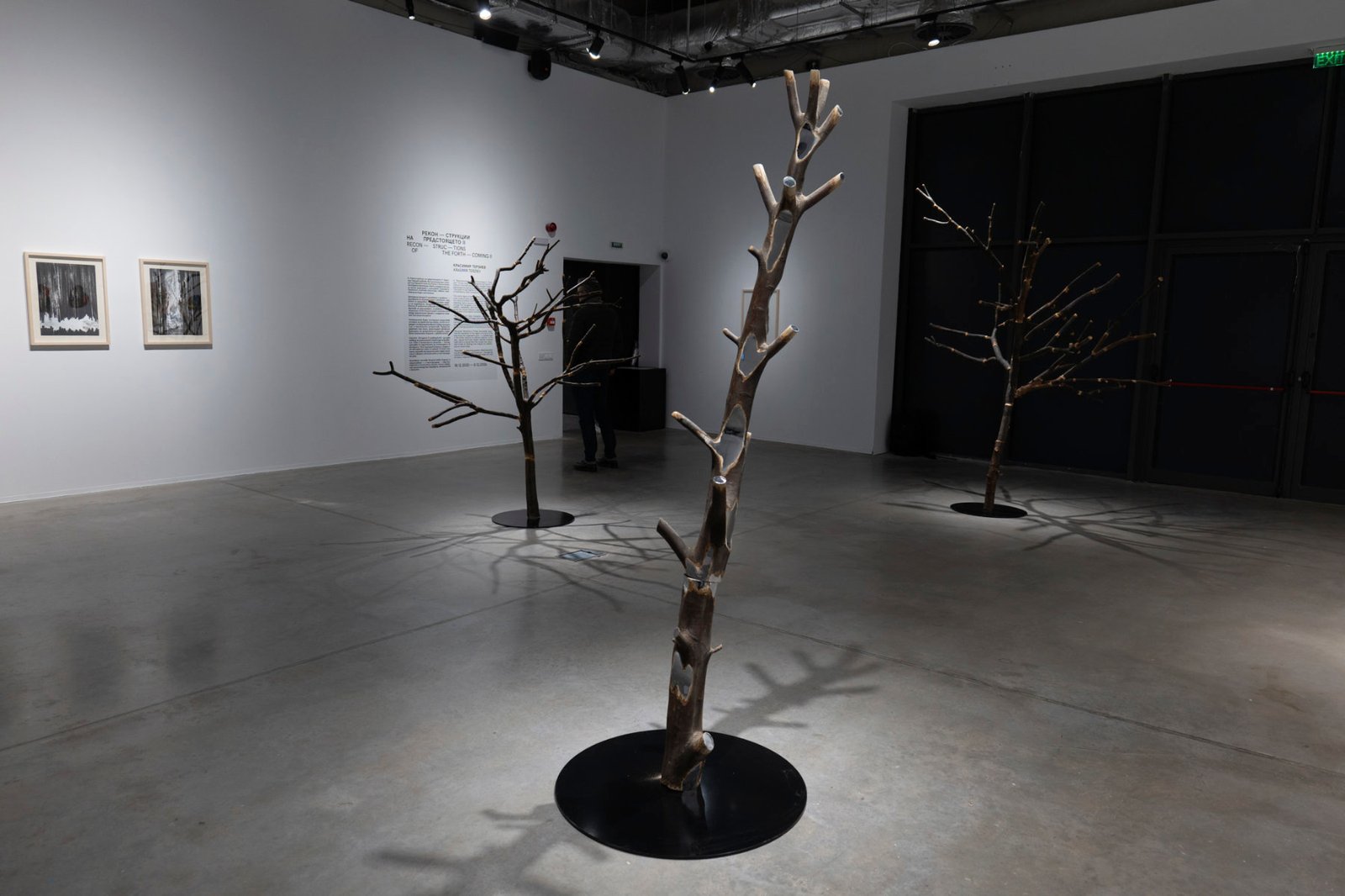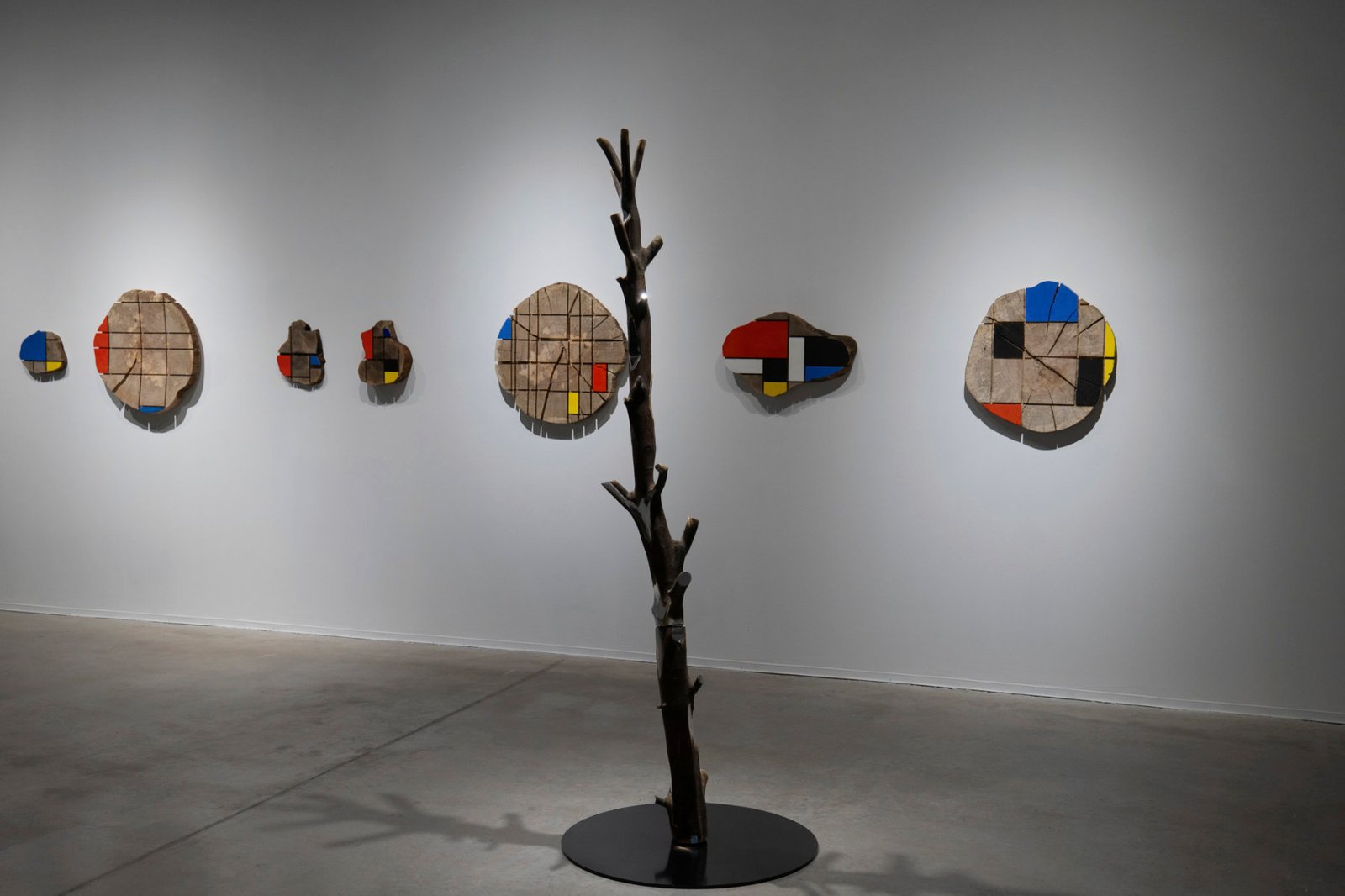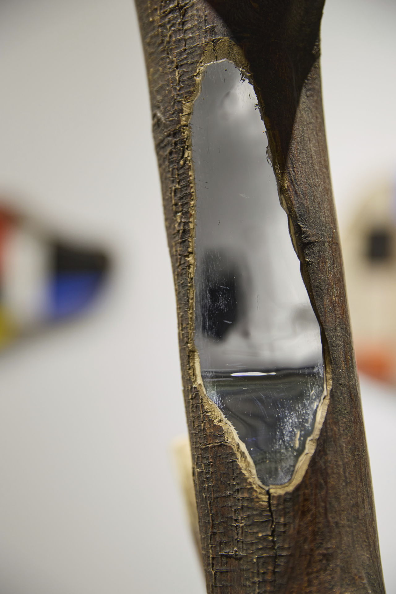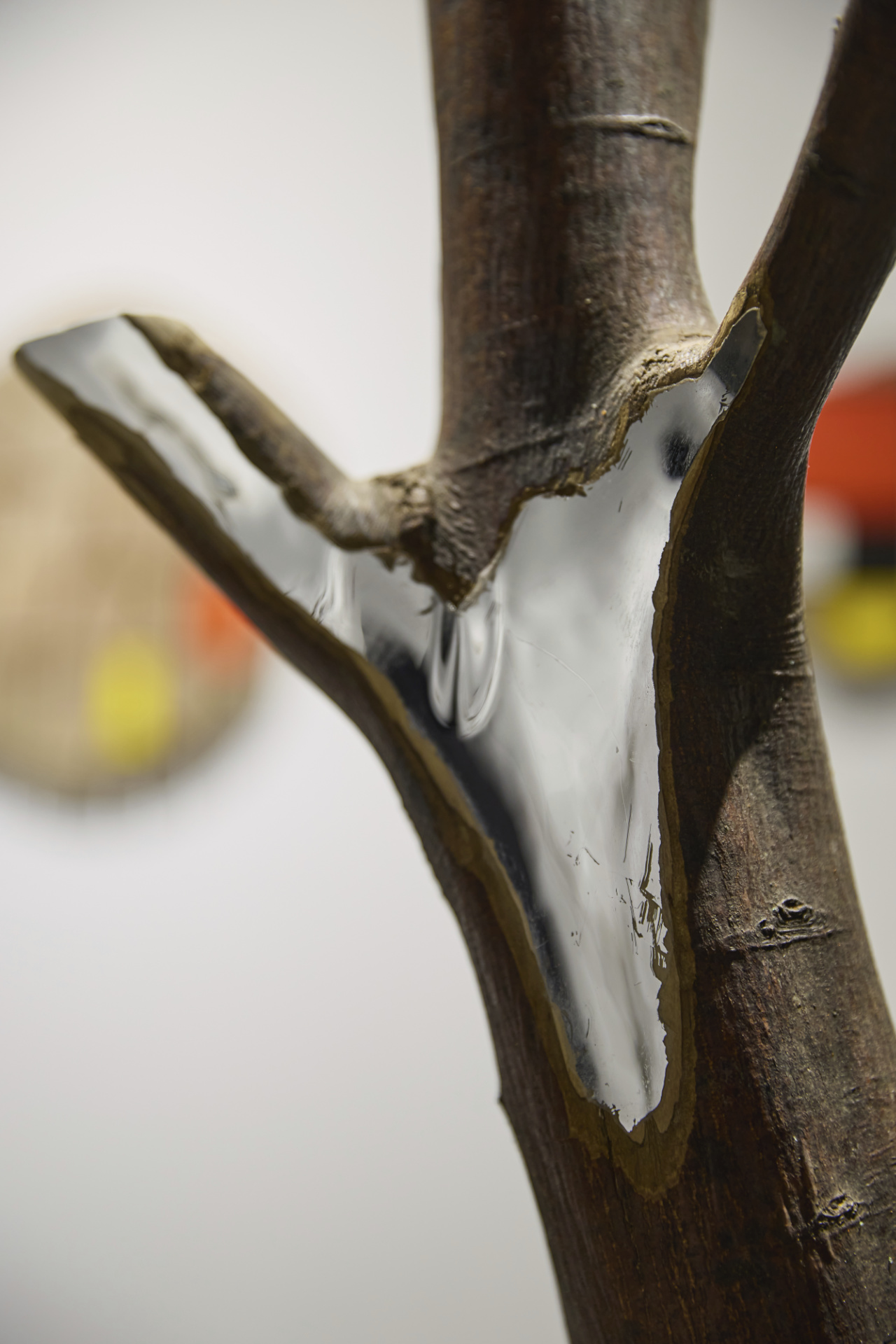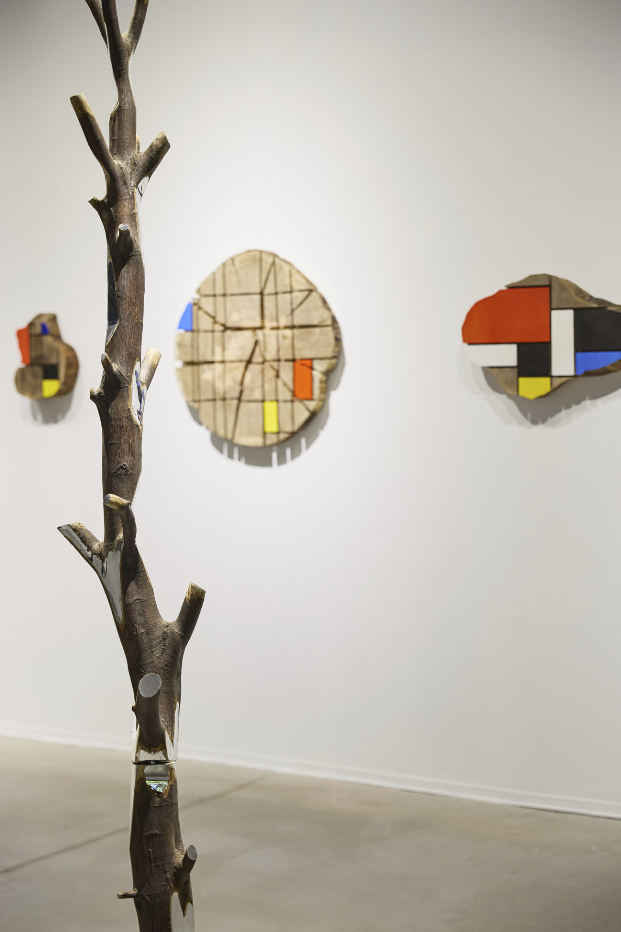 The tree is the central figure of the exhibition — materially, symbolically, and conceptually. The trunks brought into the gallery undergo gestures of decomposing, reassembling, and transformation that reveal the tension between the organic and the cultural regimes of structuring. One tree, chopped into firewood and reassembled with slight displacements, visualizes the interruption and reordering of natural growth and form. Another, shaped and polished into a mirror-like surface, turns the organic trunk into a site where the viewer literally sees themselves — a meeting point between nature and representation, between body and image.