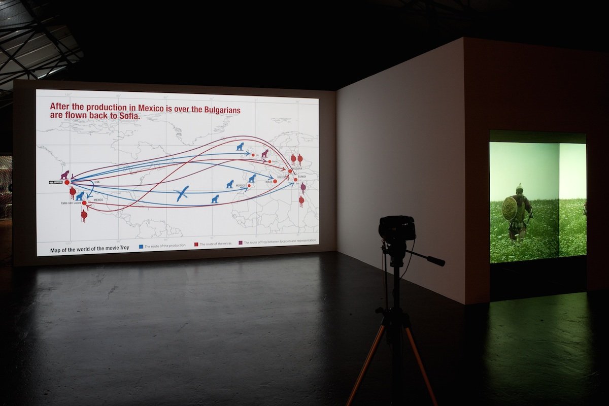 The combination of these trophy-images with the personal stories of the extras, maps of the production activities and metaphoric figures creates a narrative that questions self-identification in a war staged by globalized film industry that far exceeds the boundaries of the motion picture.